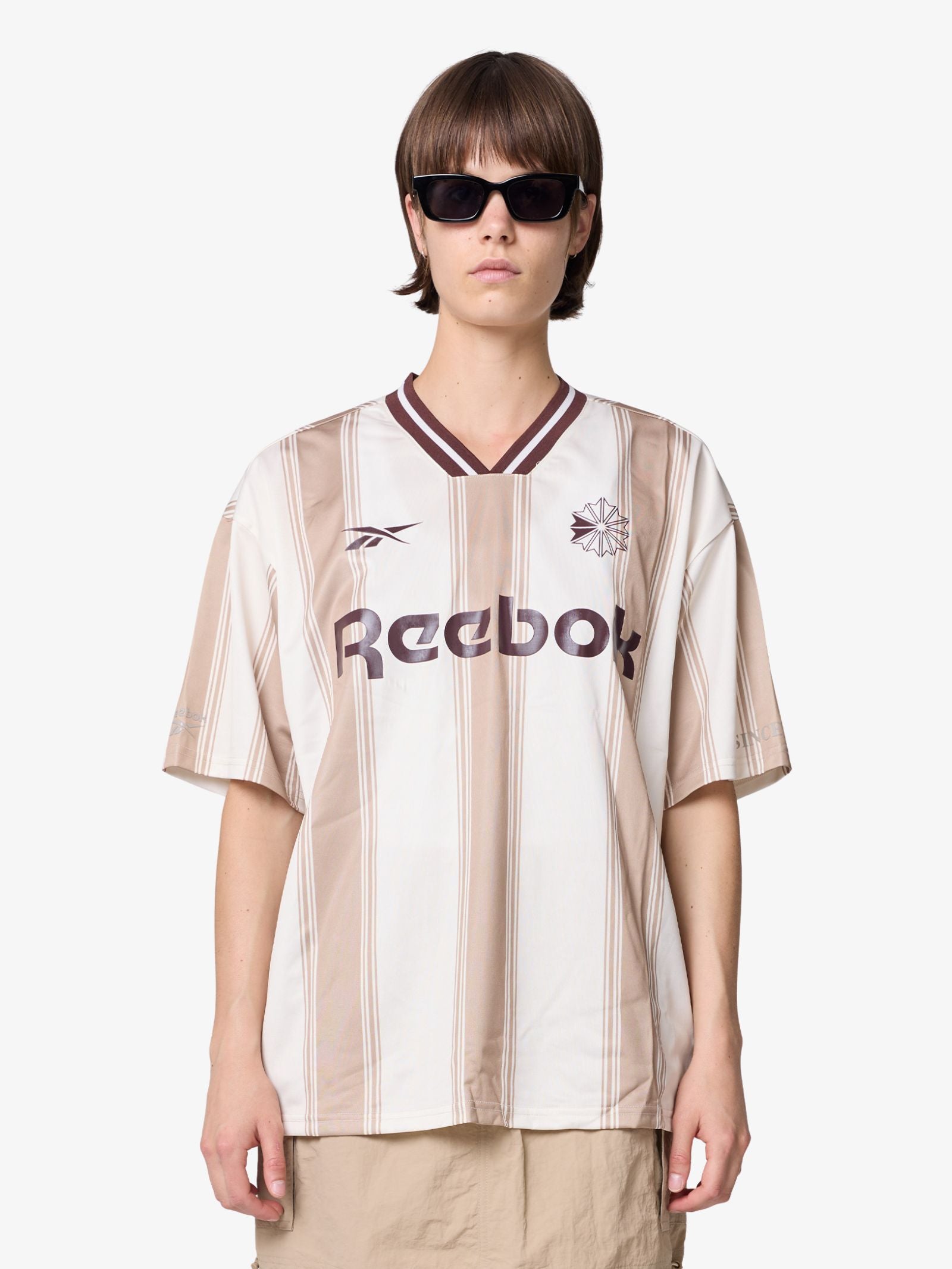 The Women's Sport Jersey by Reebok is made from a light, airy polyester knit and designed with an oversized, relaxed fit. This short-sleeve top features broad vertical stripes, a V-neck collar with trim, and a large central logo graphic across the chest.