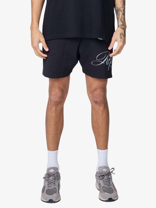 The Represent Owners Club Script Mesh Shorts by Represent are crafted from light cotton mesh and designed with a straight, relaxed fit. This short style features an elasticated waistband with an internal drawcord and a water-based script graphic printed on the leg.