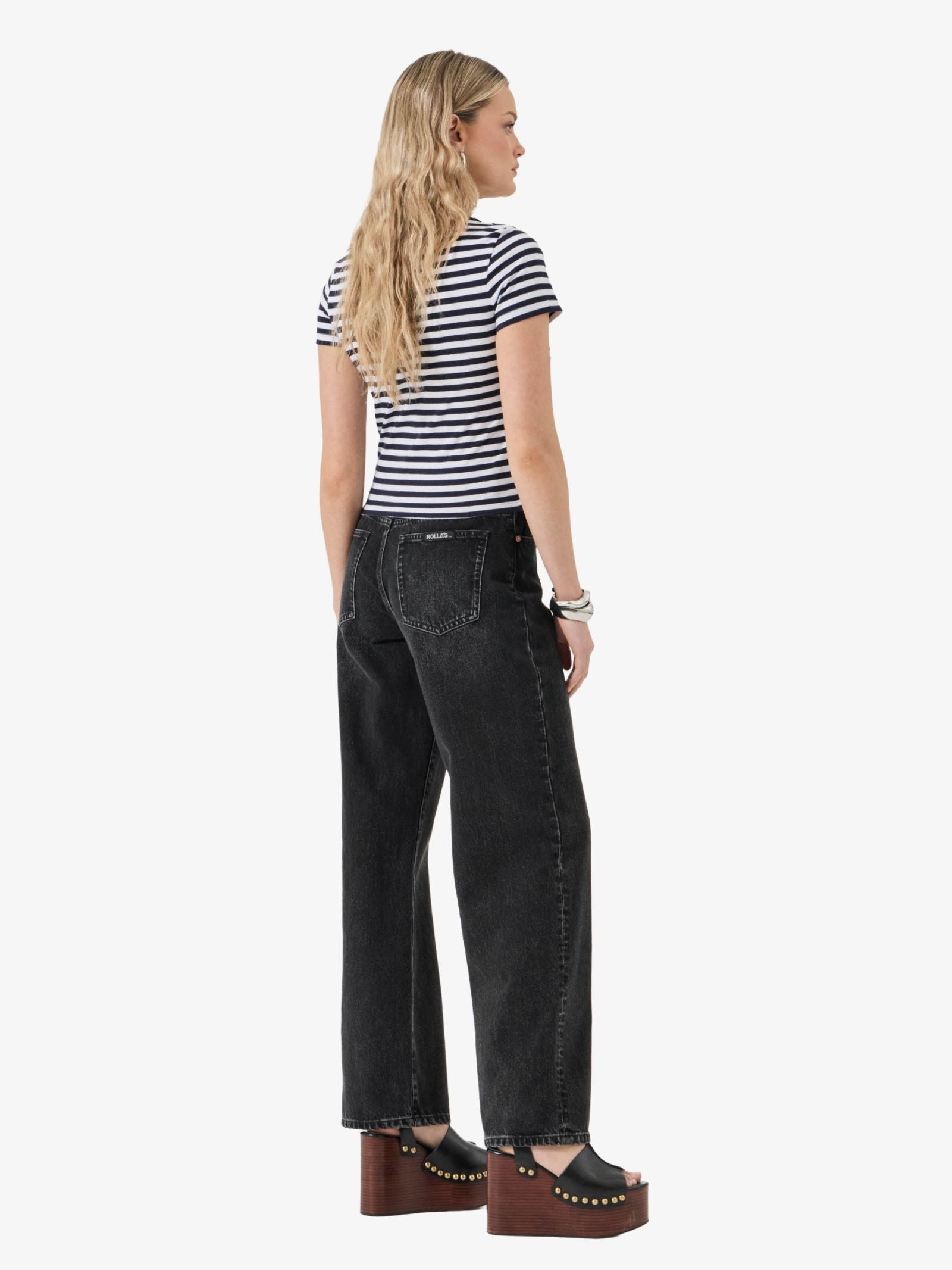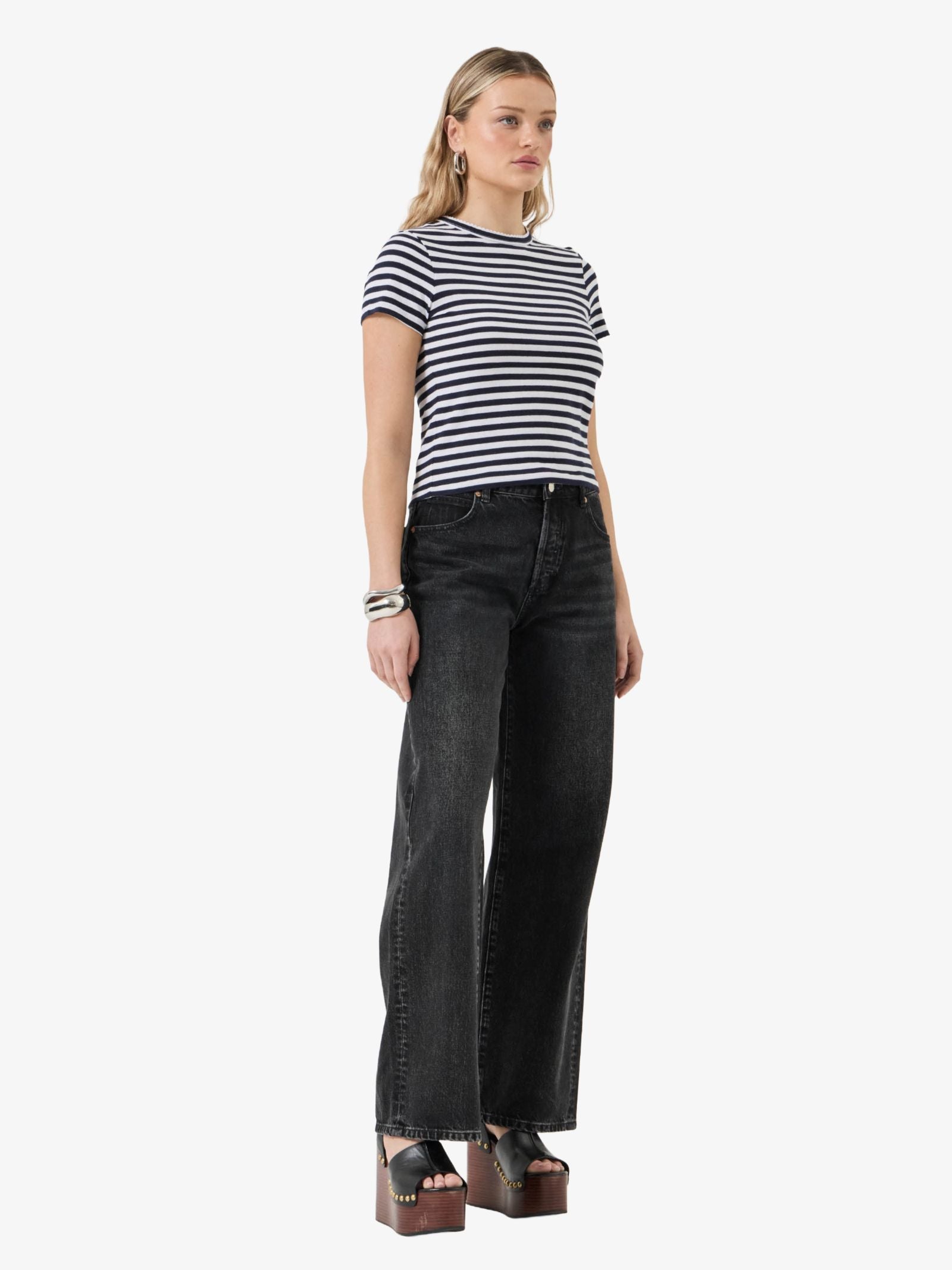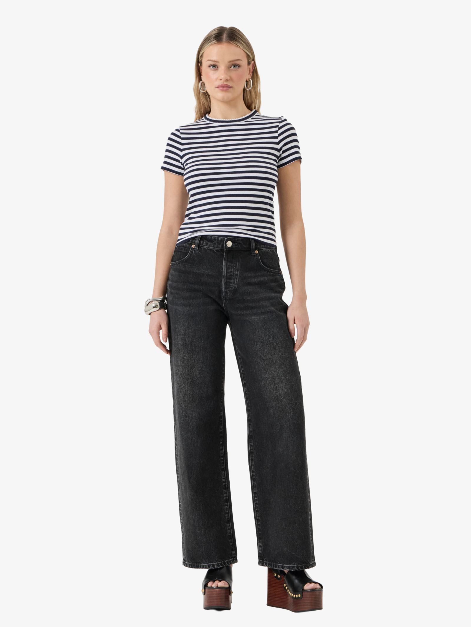 The Classic Tee Paros by Rollas is made from a soft, slubby cotton and linen blend with a loose knit, and designed with a flattering crew neck cut. This versatile shirt features a classic navy and white stripe pattern and includes vintage details like a scalloped edge neckline.