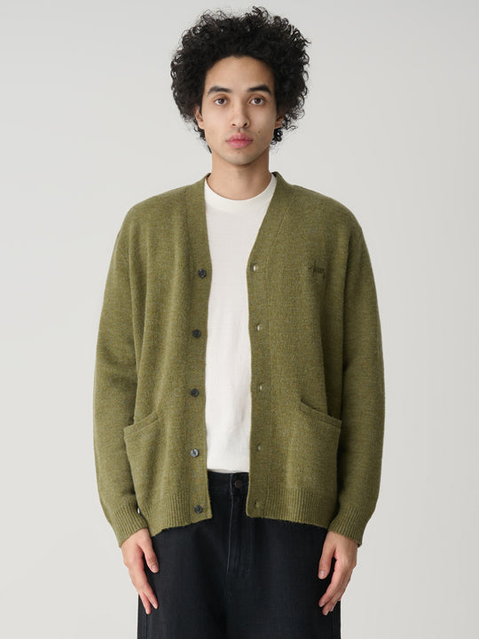 The Knit Script Cardigan by S-Double is designed in an olive-toned wool-blend knit. This button-up cardigan features a relaxed V-neck silhouette, front patch pockets, and ribbed cuffs and hem.