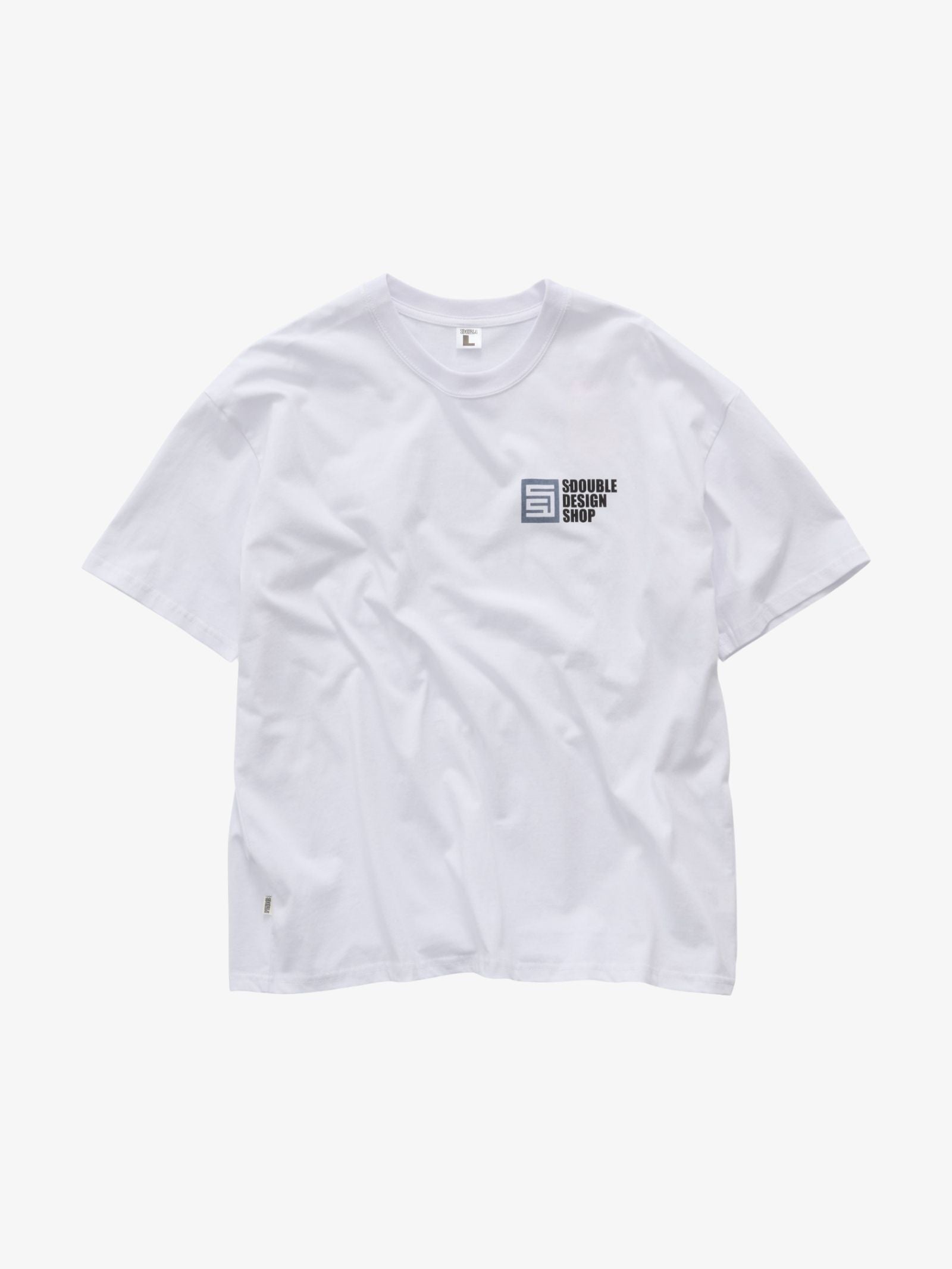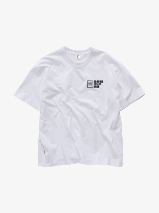 The Painter Tee by S-Double is a regular fit t-shirt constructed from raw, unbleached cotton jersey. This garment features a small "S-Double Design Shop" graphic on the chest and a large character graphic with "S-Double Design Shop" text across the back.