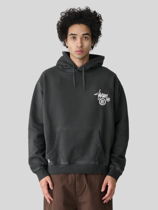 The Shawn Dot Hood in Washed Black by S-Double is crafted from a soft cotton-polyester blend (60% Cotton, 40% Polyester). This hoodie features a drawstring hood, a kangaroo pocket, and screen-printed logos on both the front and back.
