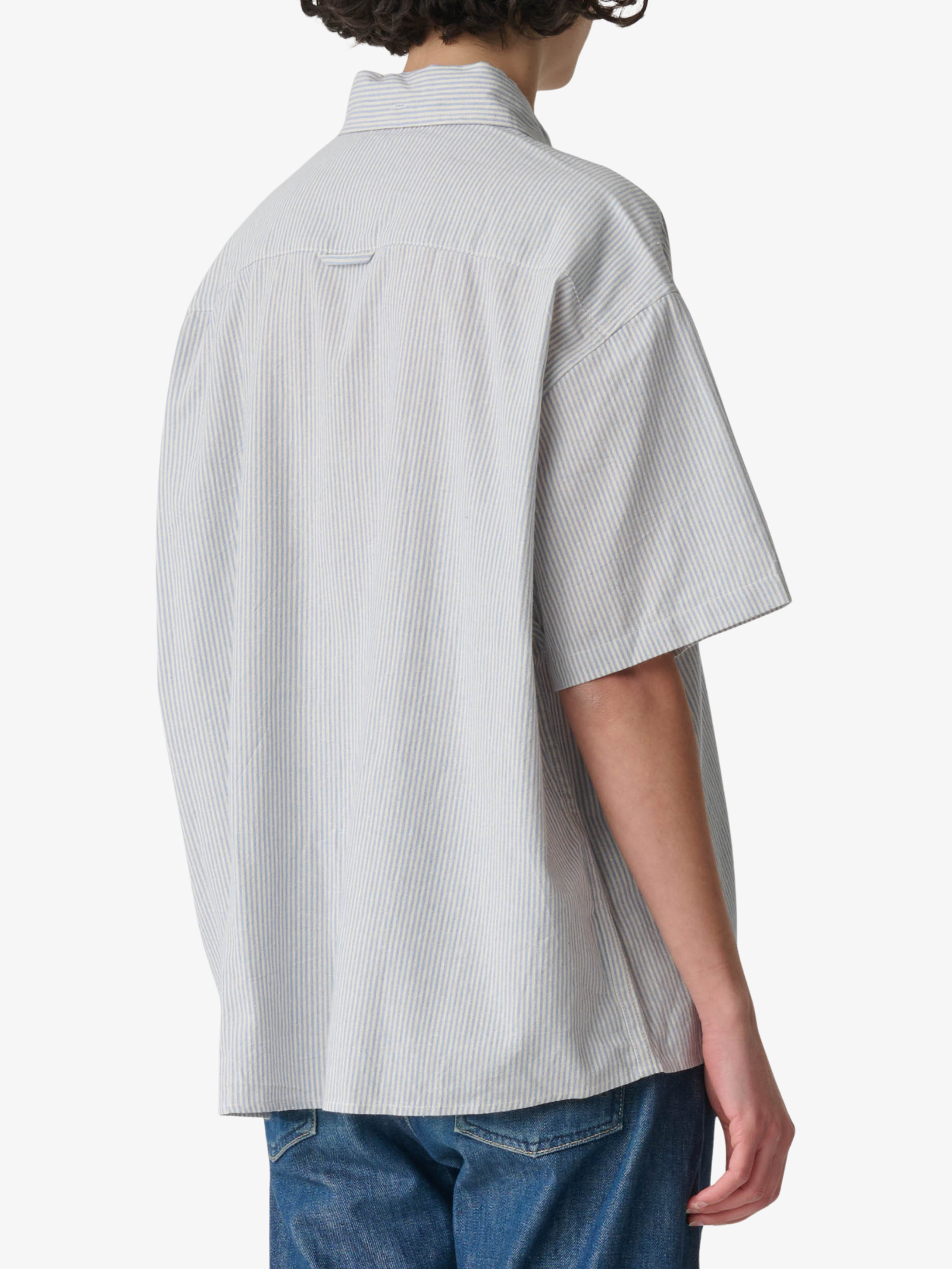 The S-Double Women's Stripe Short Sleeve Shirt by S-Double showcases a classic vertical stripes. This shirt is crafted from lightweight fabric and features a button-up front.