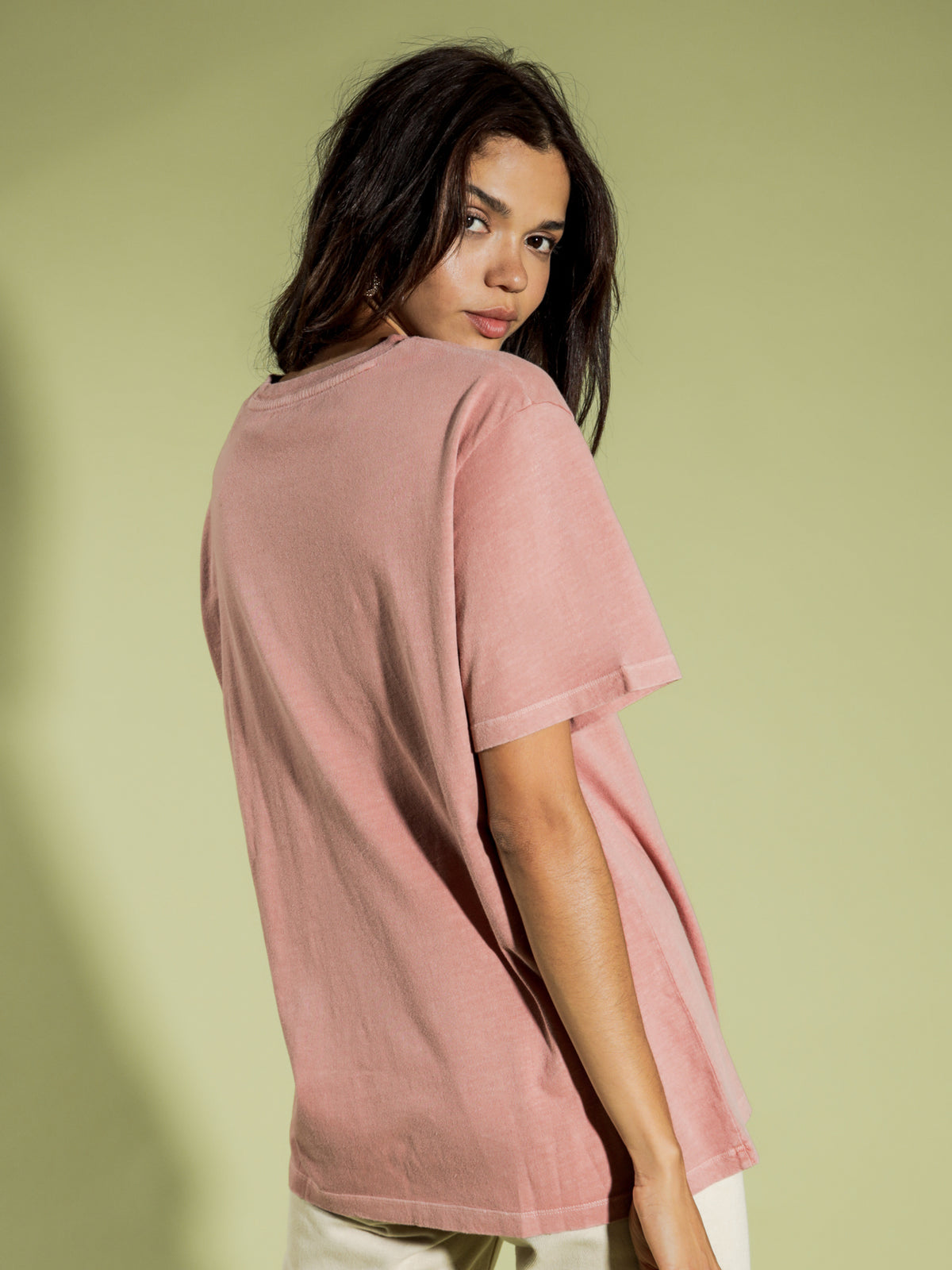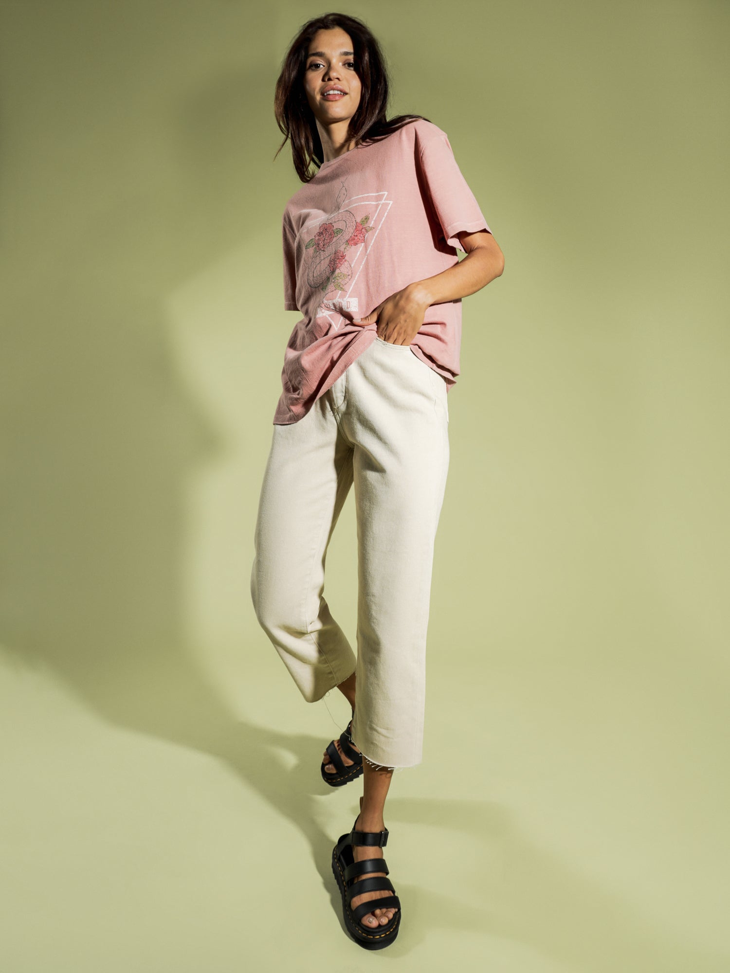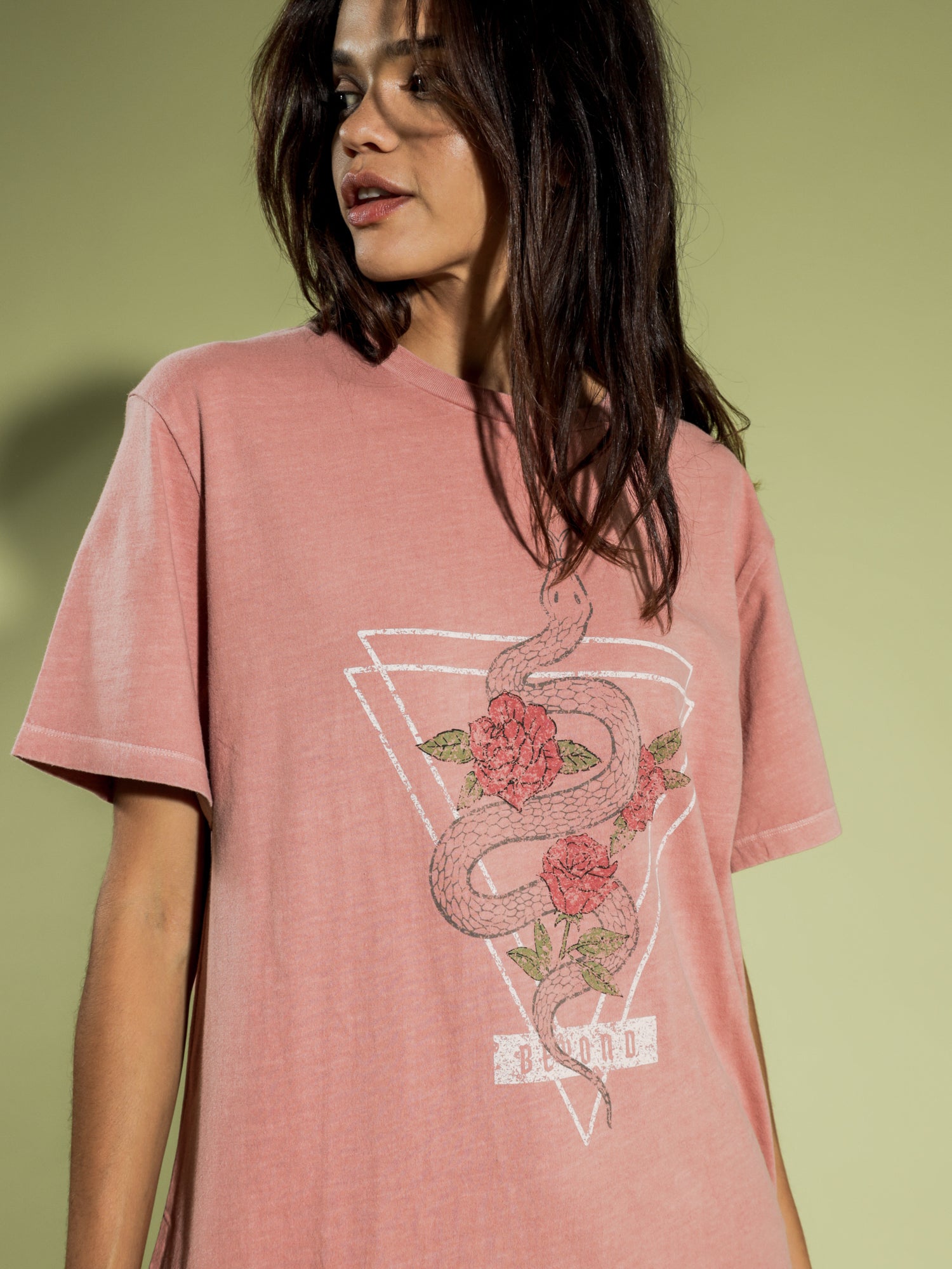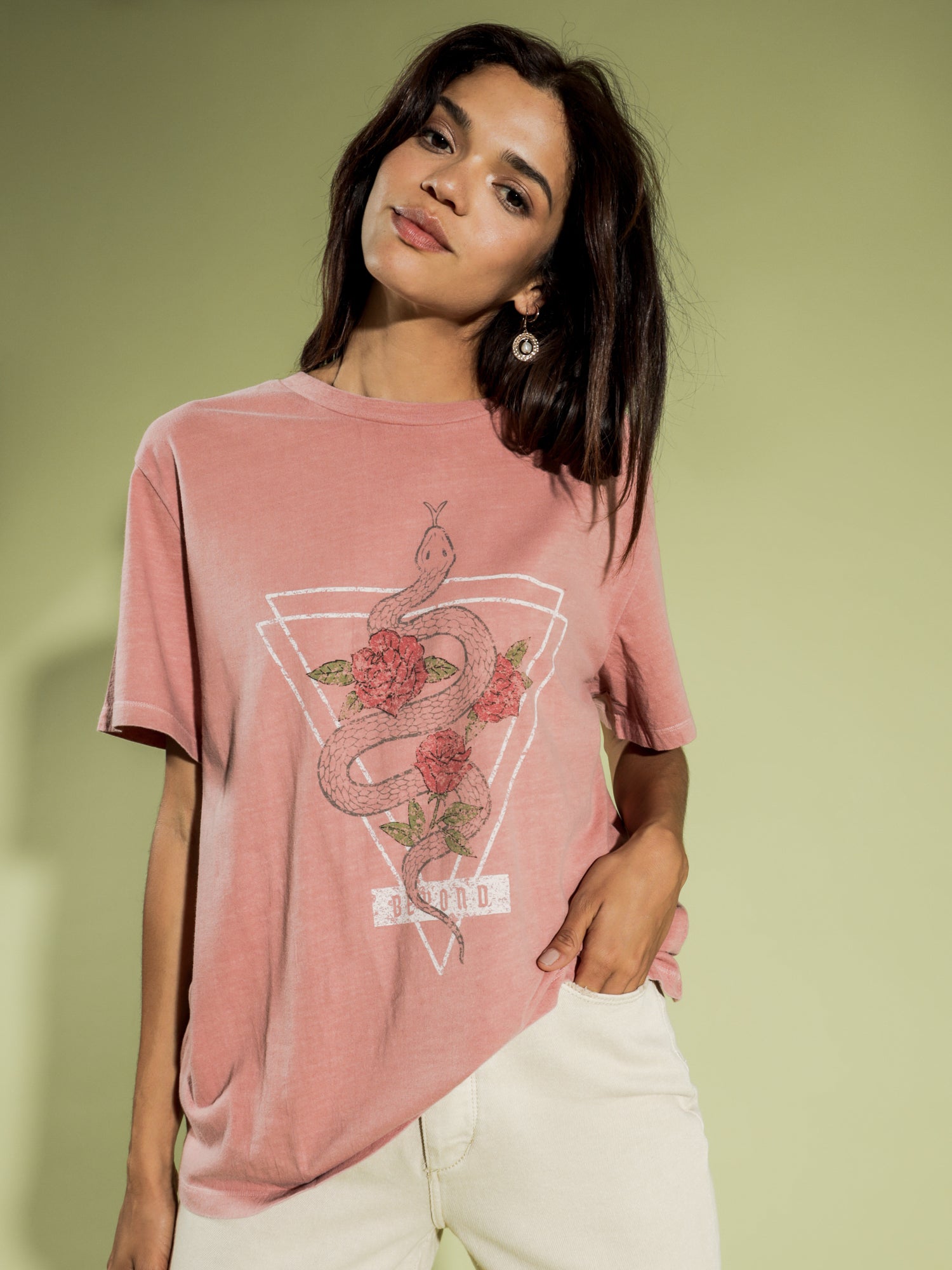 The Snake and Roses tee is an oversized fit featuring a vintage wash. Style is back with some light wash jeans, chunky sandals and gold jewellery for a fun day out.