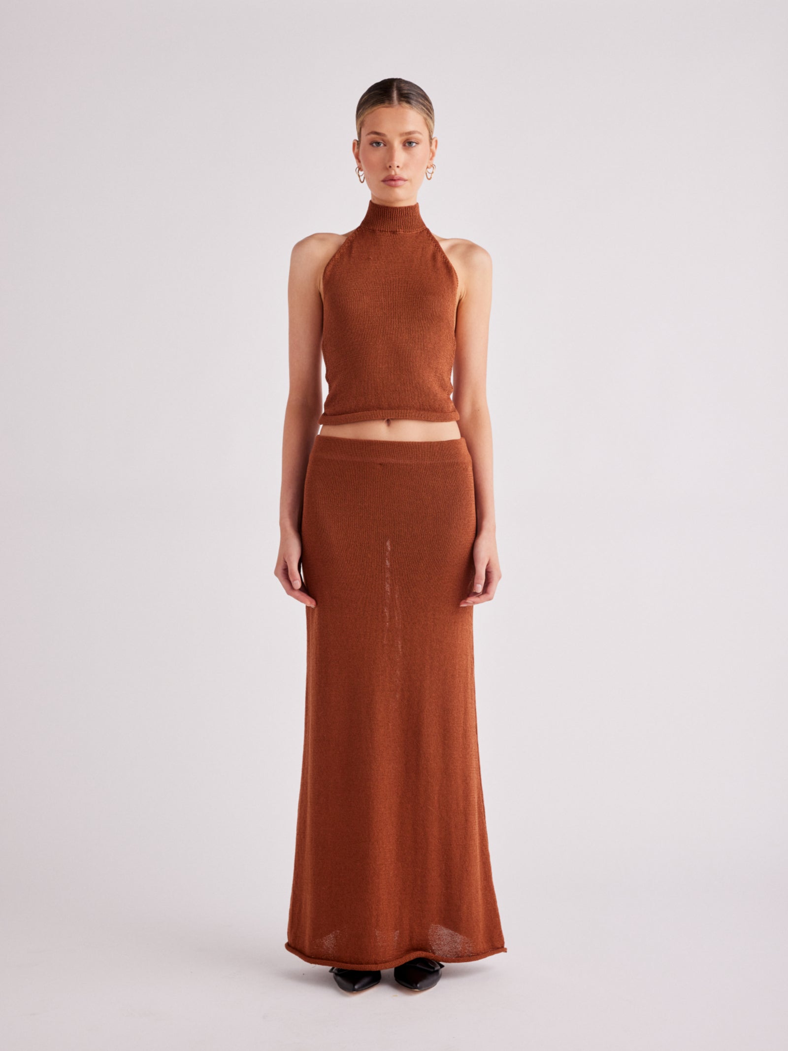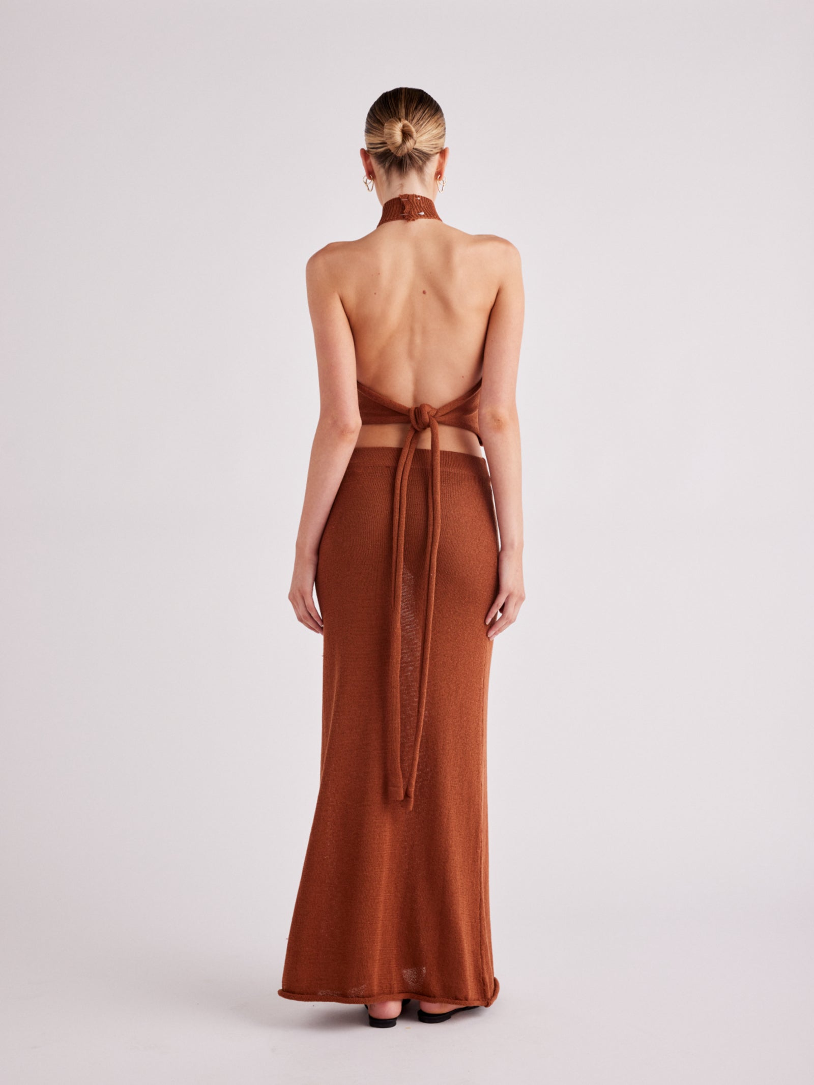 The Cali Halter Top in Nutmeg by SNDYS is crafted from lightweight, semi-sheer knit using recycled fibers. This top features a high halter neckline with a button closure and an adjustable long tie-back for a customizable fit.