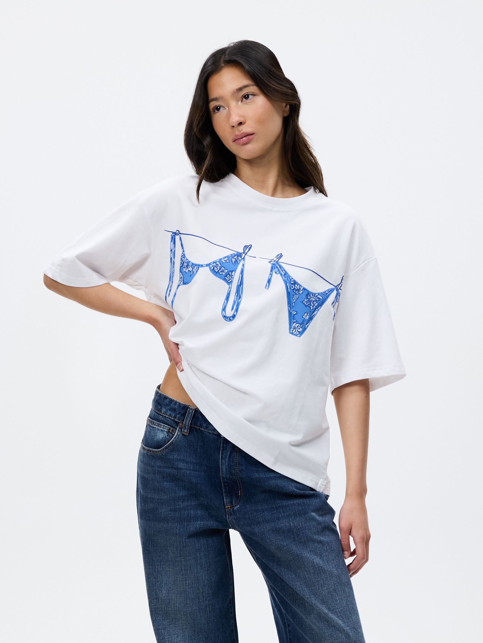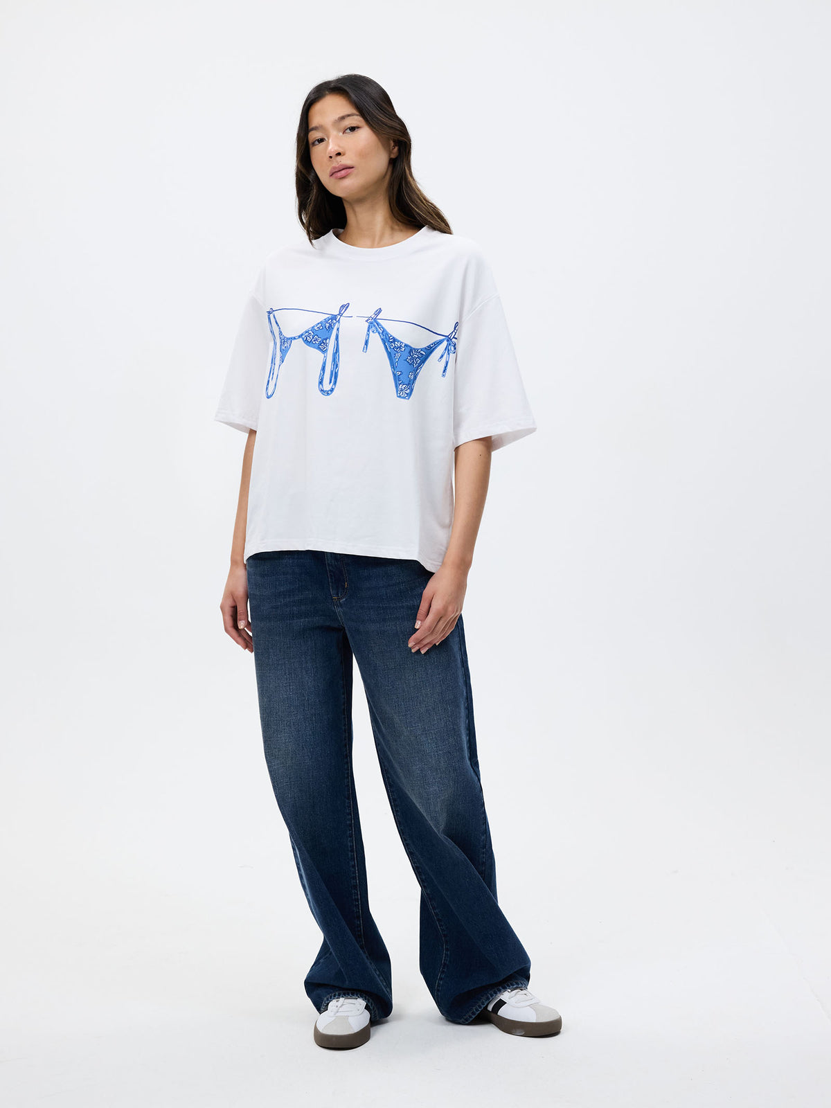 The Mai Tai T-Shirt in Bikini by SNDYS is crafted from a heavyweight cotton jersey and offers a soft hand feel and a structured drape. This tee features an oversized, relaxed fit with drop shoulders.