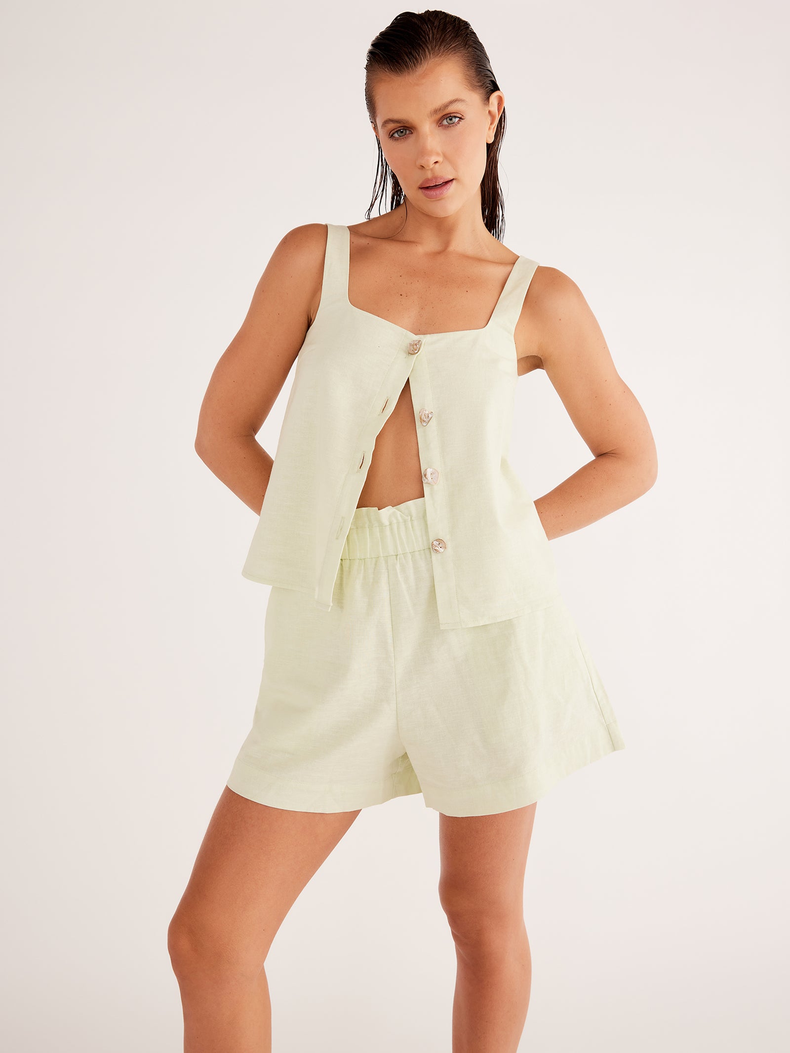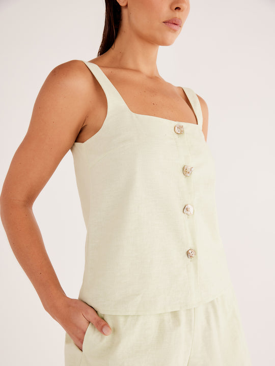 Crafted from a linen-cotton blend, this hip-length top features a stylish square neckline and irregular pearled shell buttons down the center front. Fully lined and non-sheer, it fits true to size for a comfortable, flattering look.
