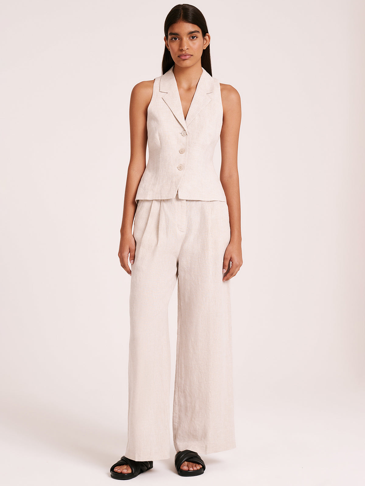 The Thilda Linen Vest by Nude Lucy tailored linen vest comes in a natural tone and features a deep V-neckline with a structured collar. Designed with classic waistcoat detailing, it includes a shell button front closure and a clean, tailored silhouette.