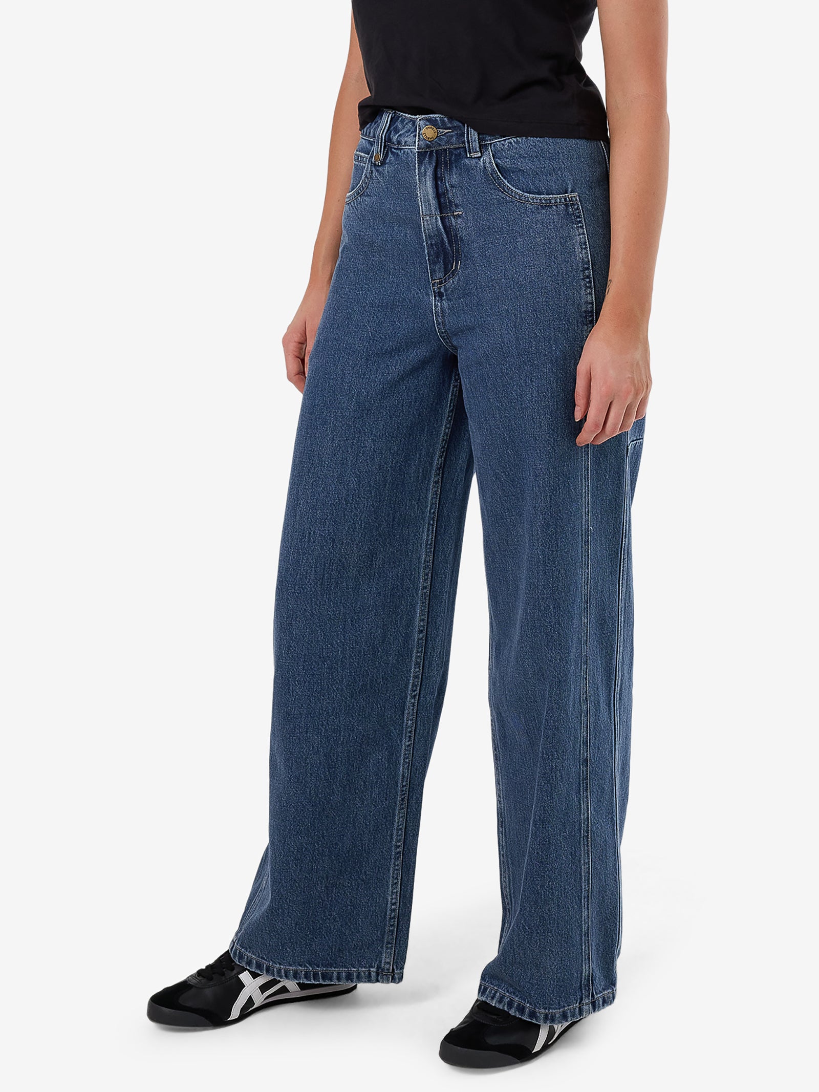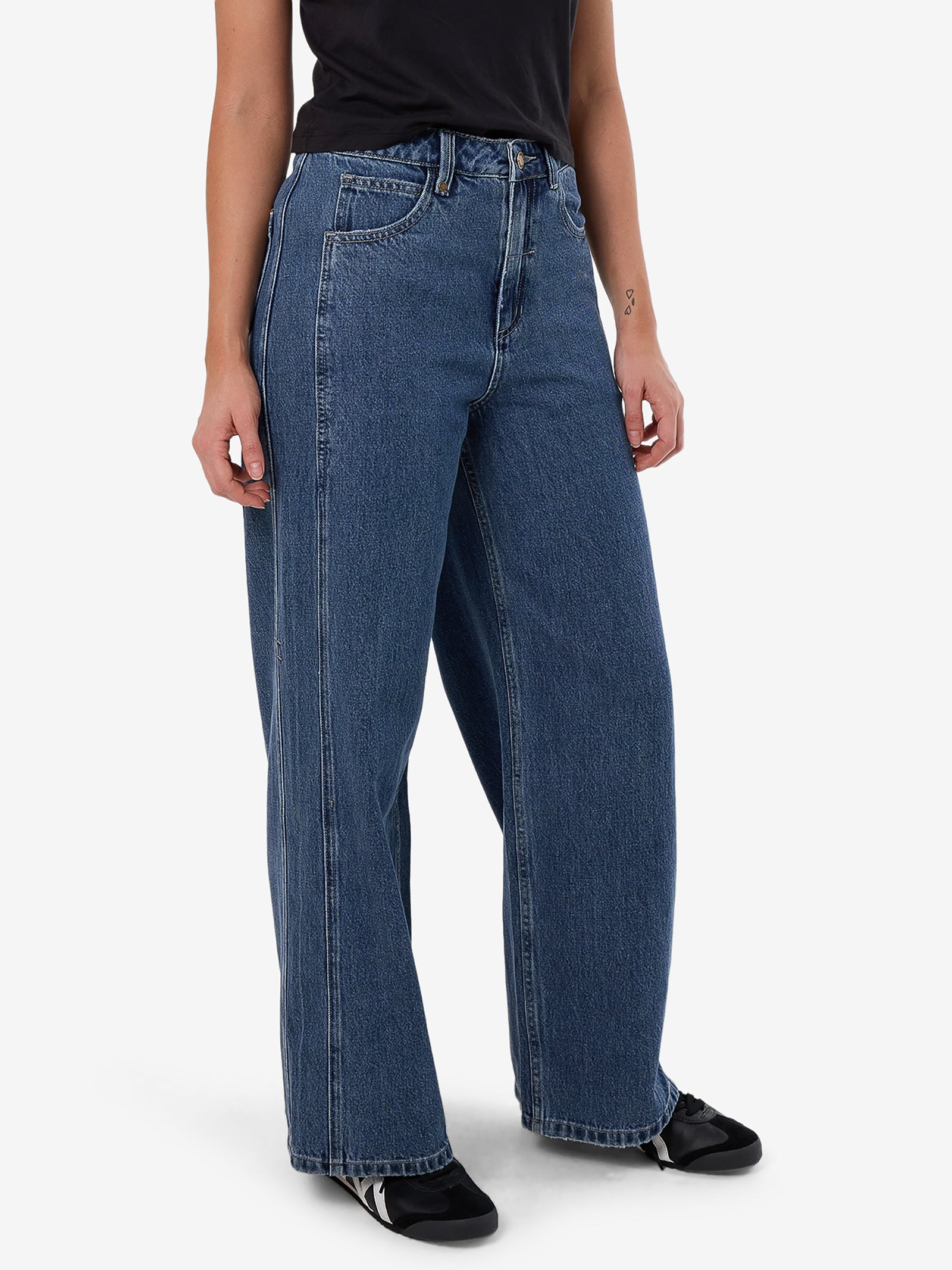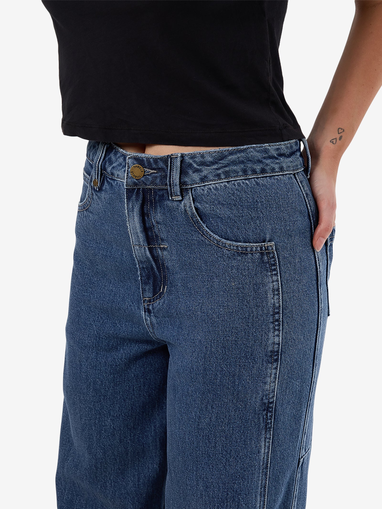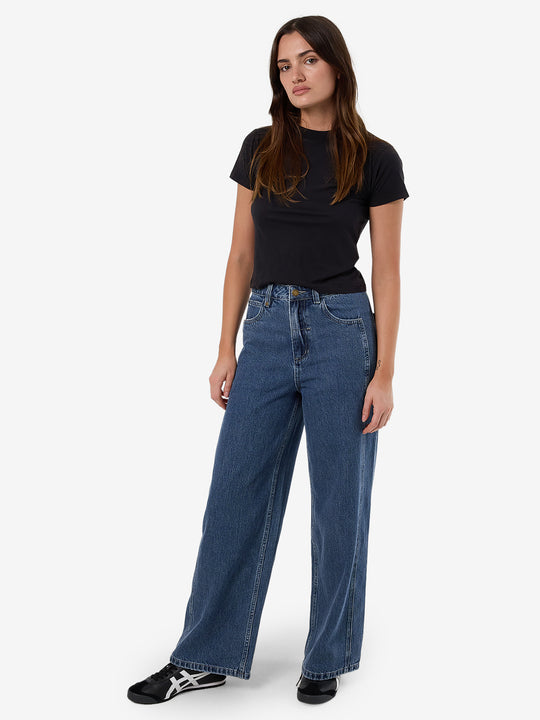 The Ashton Jean in Vintage Rinse Blue by Thrills is crafted from heavyweight 12 oz organic cotton denim. These jeans feature a high-rise waist and a wide, straight-leg silhouette and a vintage rinse blue wash.