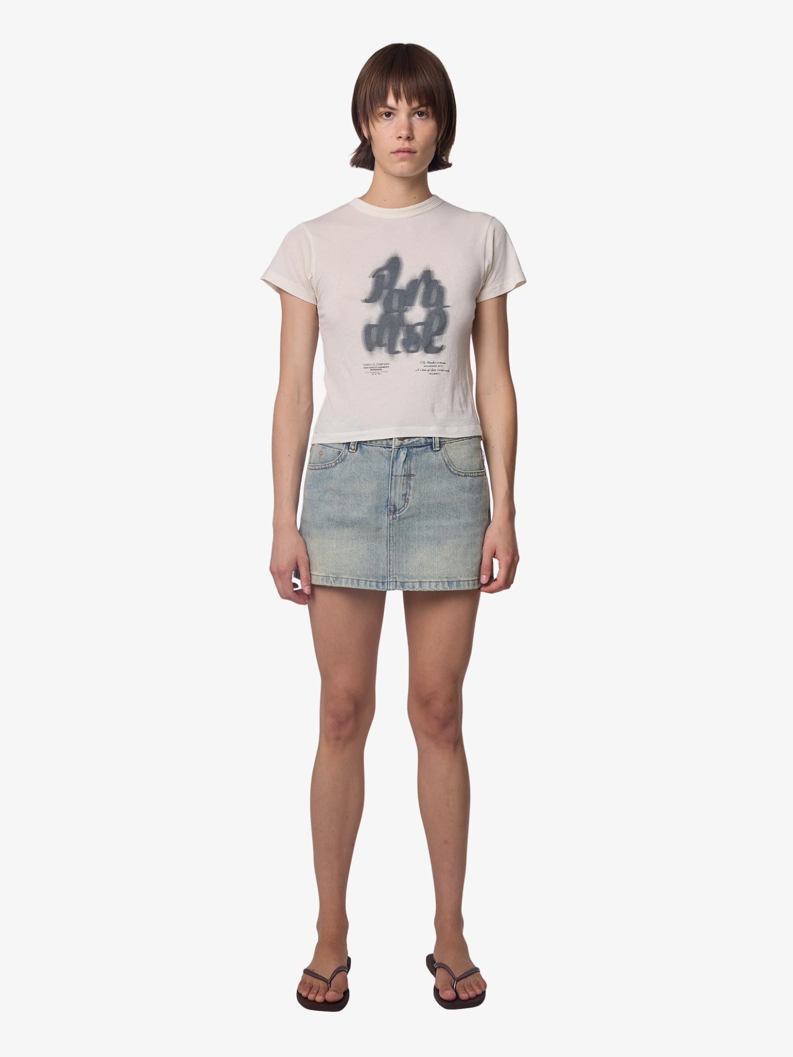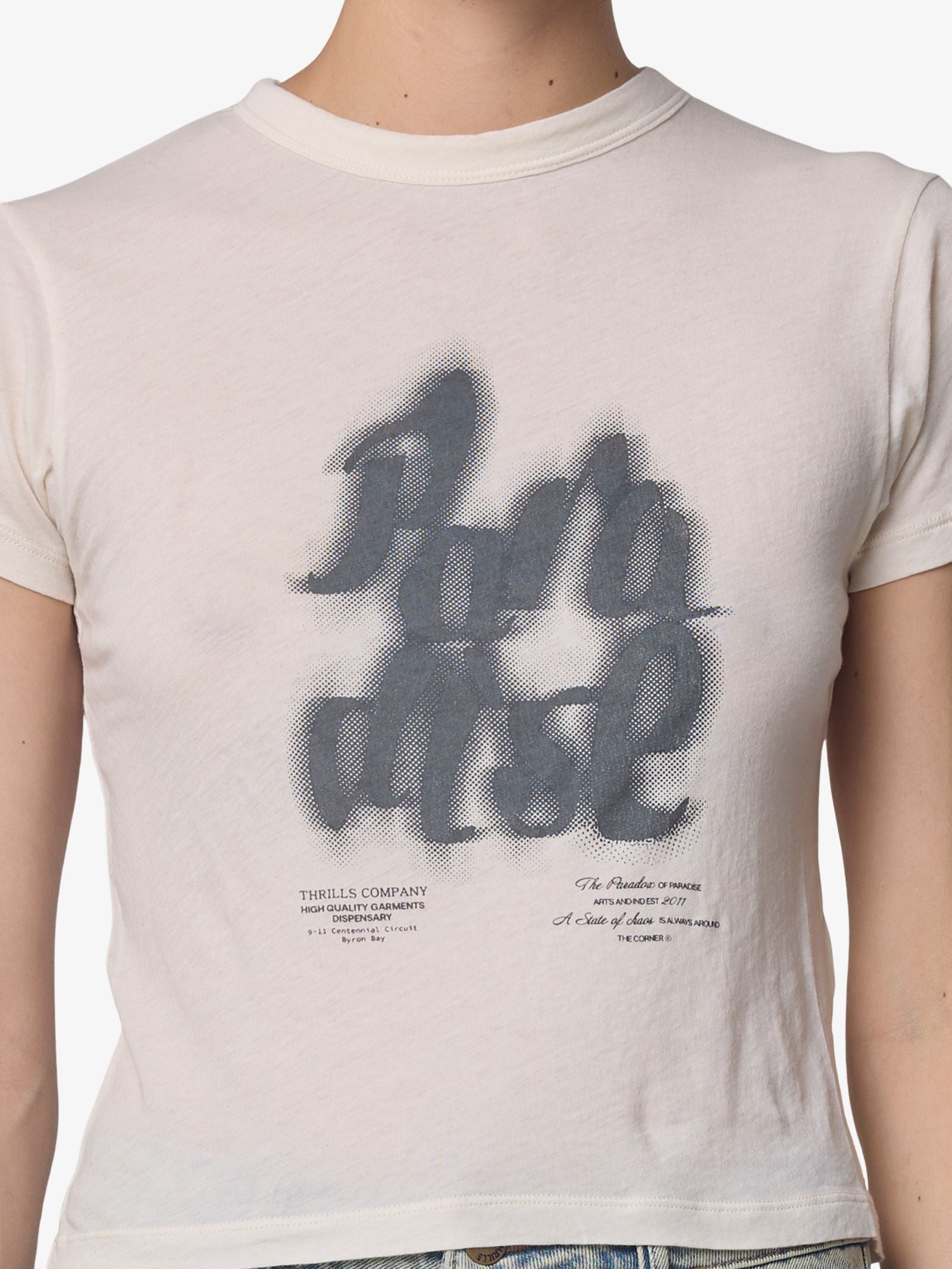 The Chaos Calls Boy Tee by Thrills is made from soft cotton jersey and designed with a slim, cropped fit. This short-sleeve shirt features a spray-painted style script graphic across the chest, complemented by small micro-text details below the main artwork.