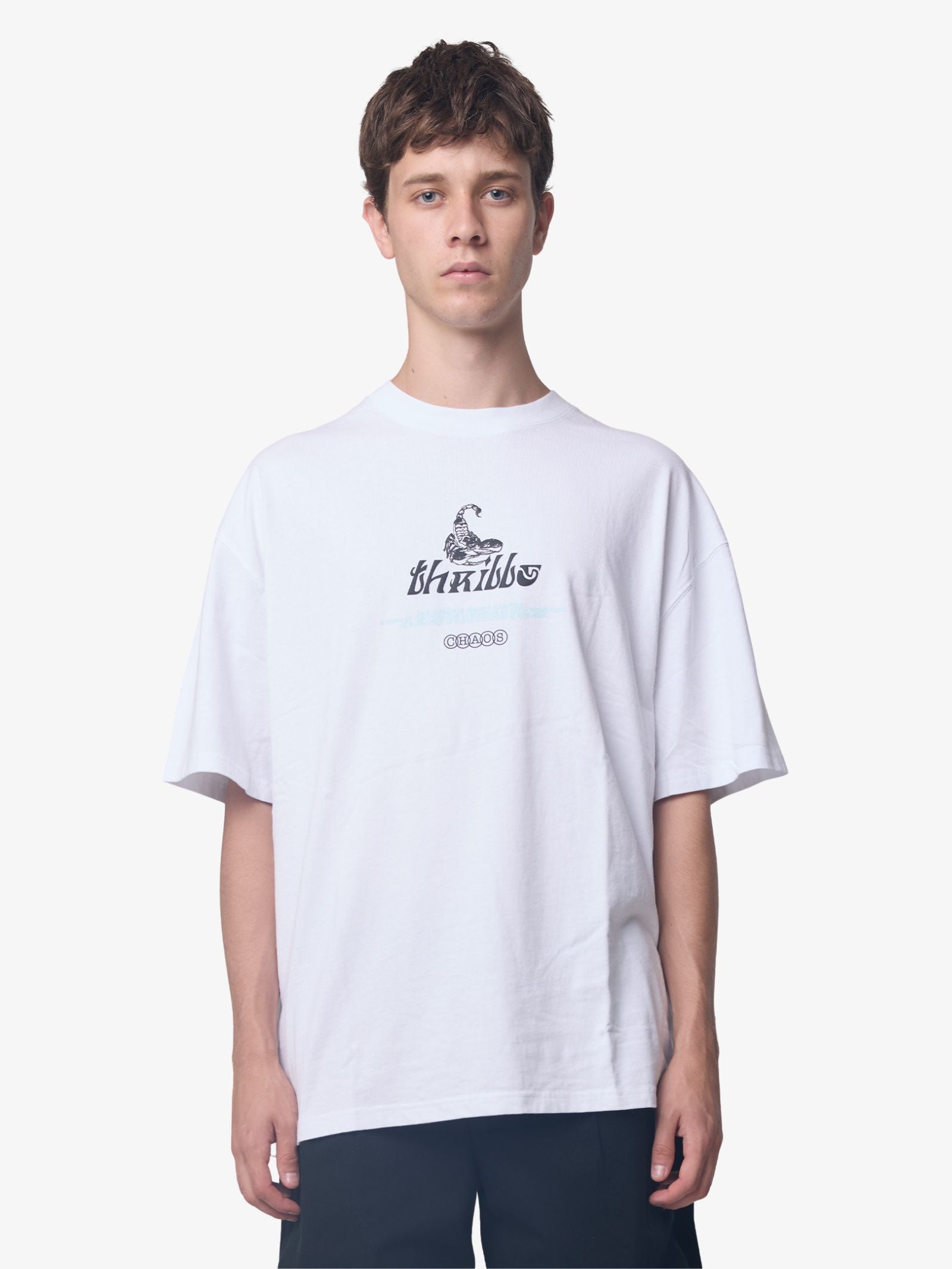 The Chaotic State Box Fit Oversize Tee by Thrills is a comfortable t-shirt designed with an oversized, boxy fit and dropped shoulders. It features a graphic print on the front chest and a large, multi-image scorpion graphic print across the back, adding a bold visual element to the silhouette.