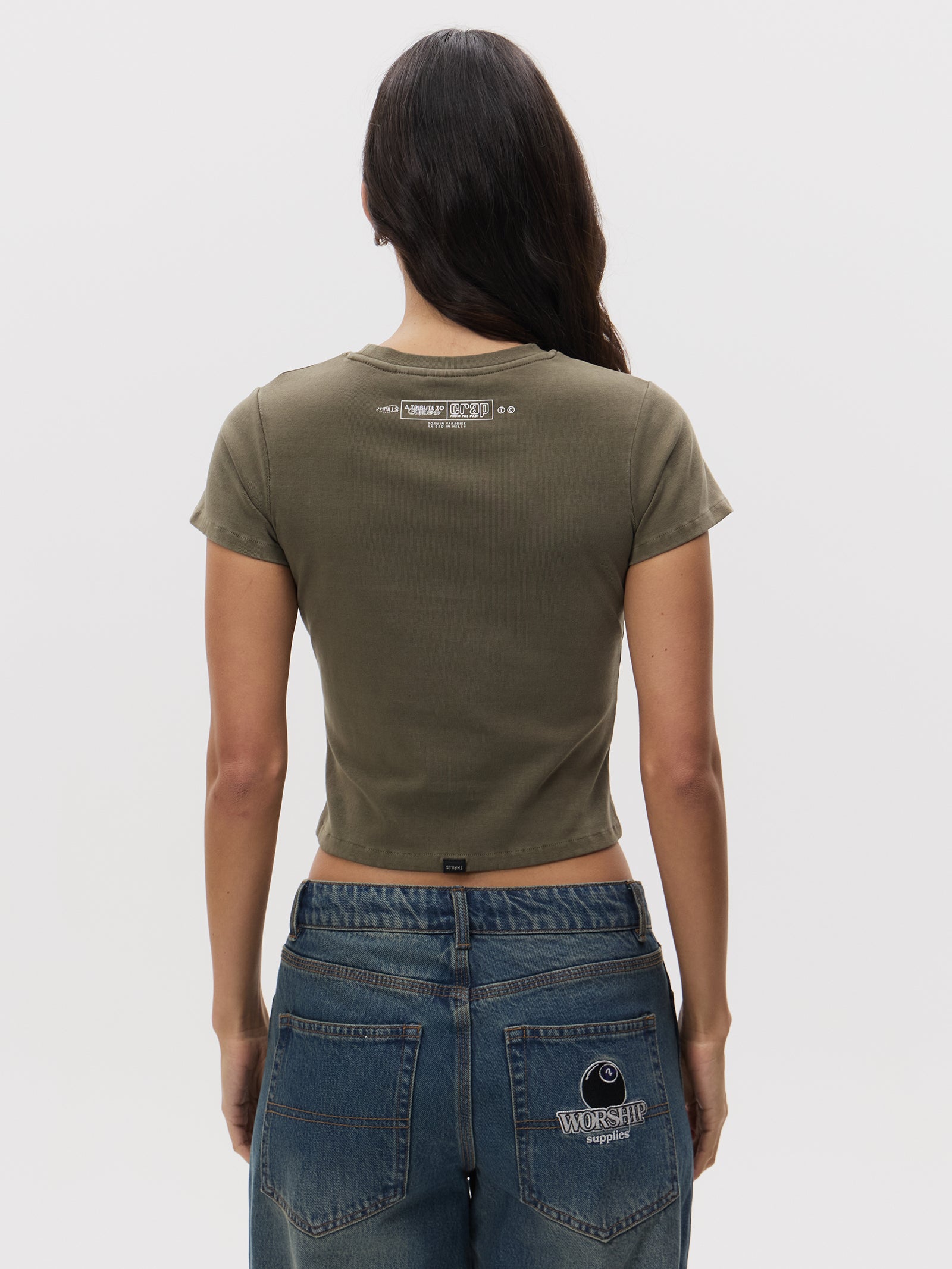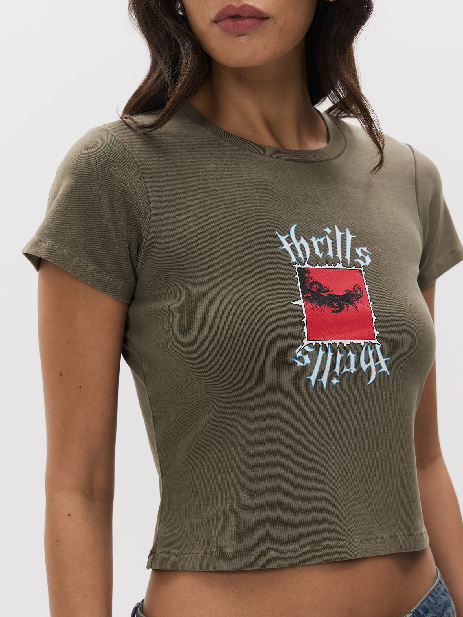 The Cheap Thrills Mini Tee in Tarmac by Thrills is crafted from a soft and stretchy organic cotton blend. This tee features a flattering cropped silhouette fit.