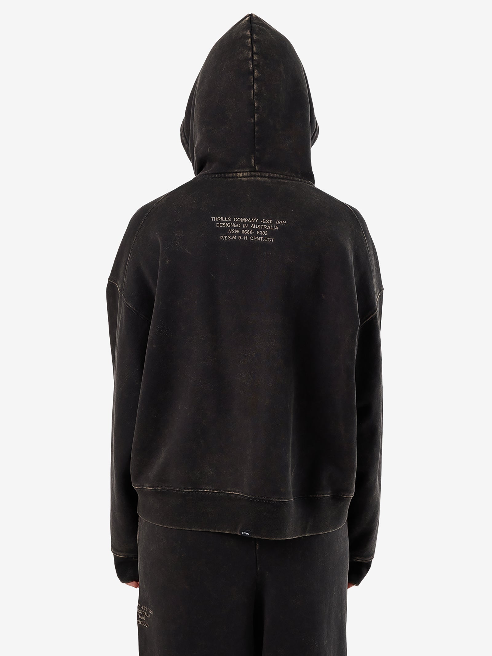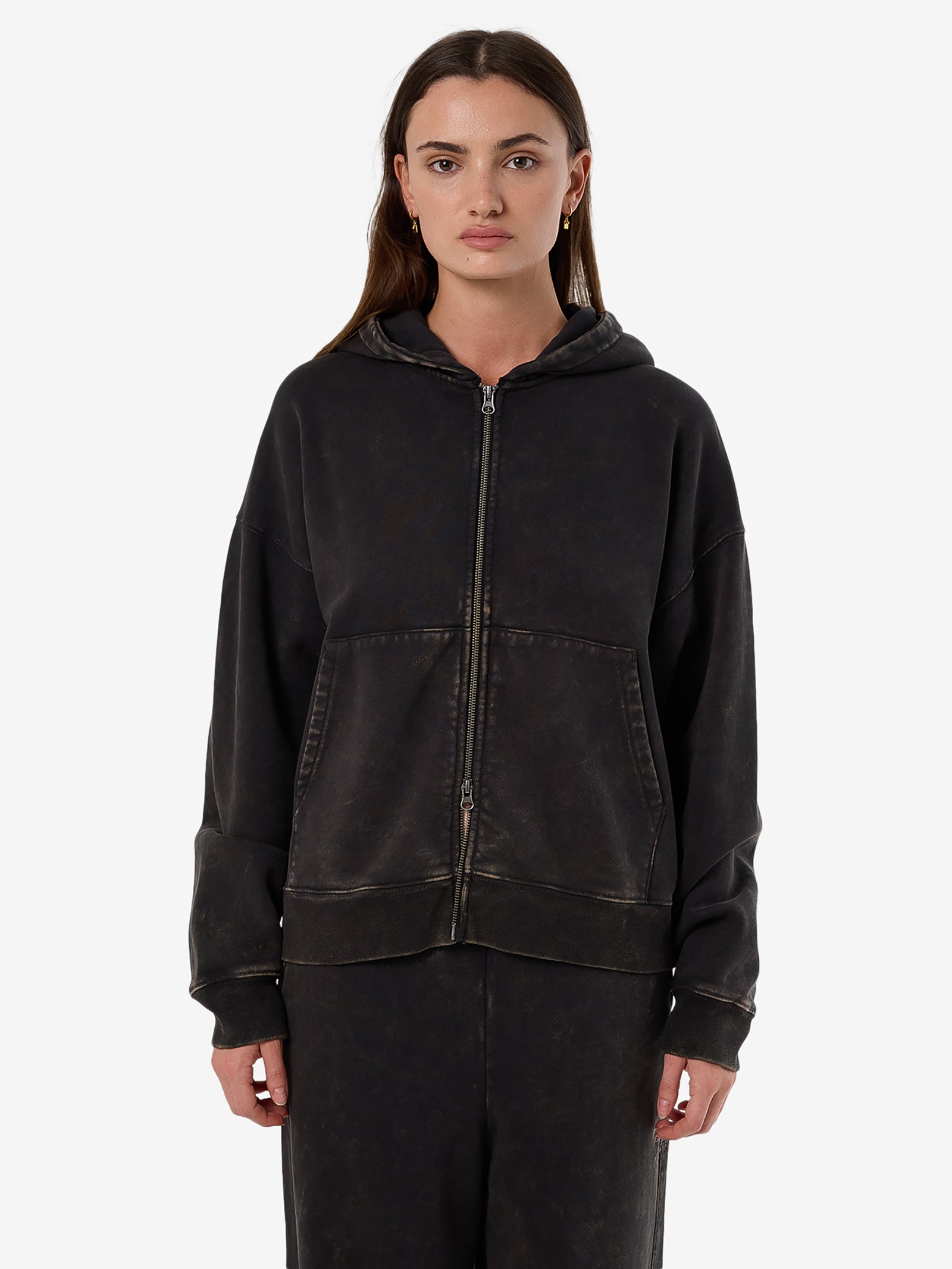 The Dissolve Zip Hood Fleece in Soot by Thrills is crafted from heavyweight 100% organic cotton brushed fleece. This hoodie offers a soft, cozy feel and a full-zip design, adjustable hood, and kangaroo pocket.