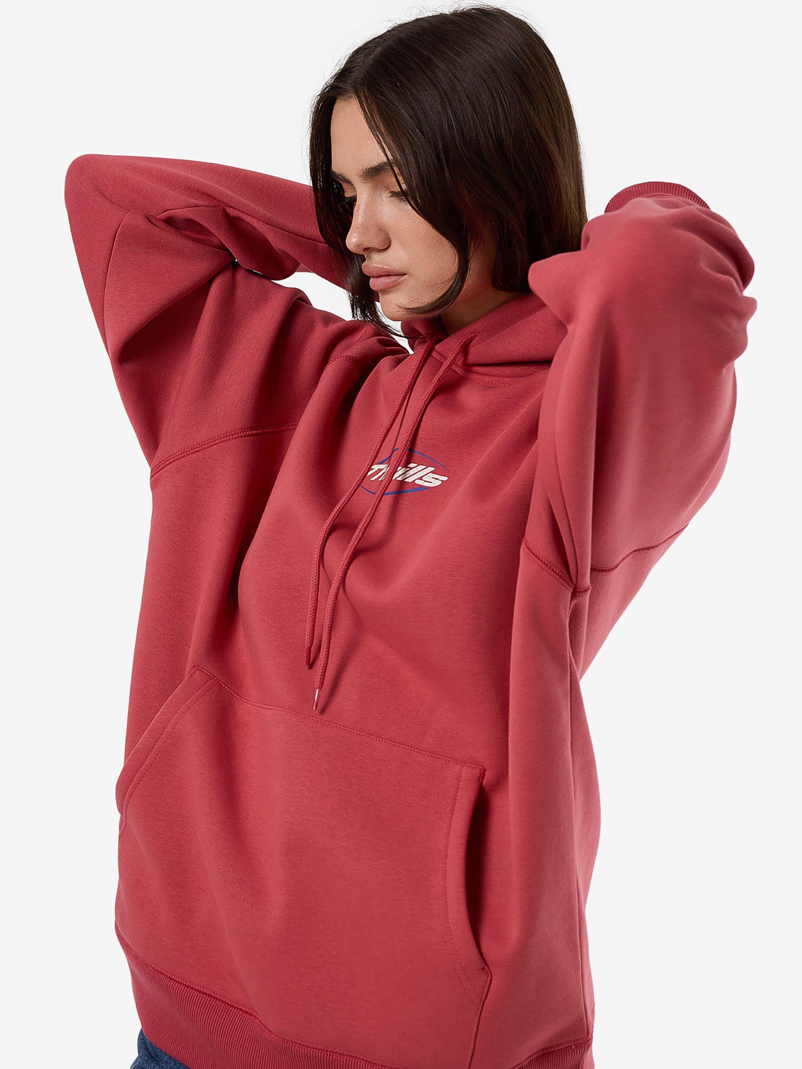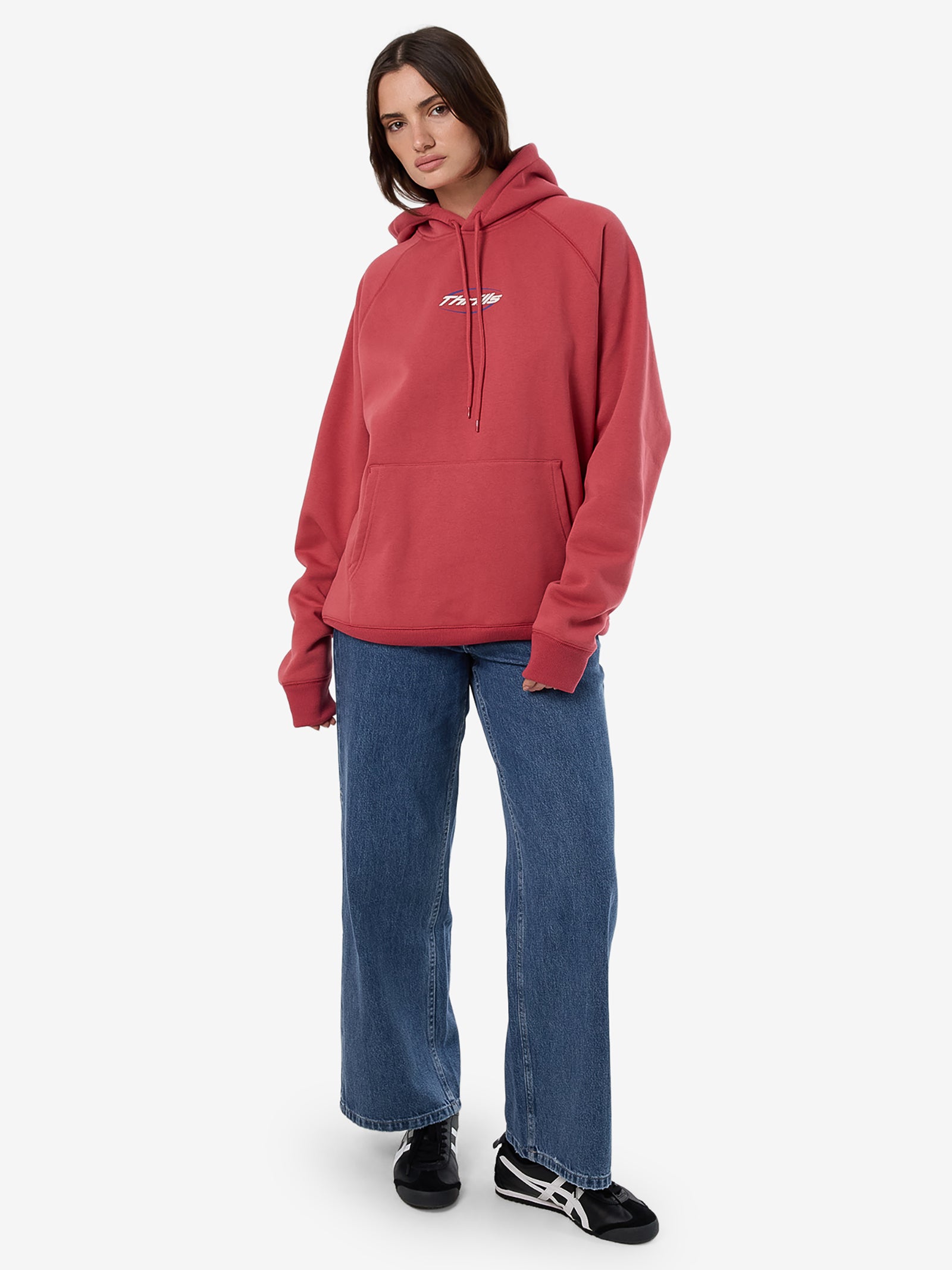 Thrills is crafted from a heavyweight 450gsm brushed fleece composed of 60% organic cotton and 40% polyester. This hoodie features raglan sleeves and kangaroo pocket.
