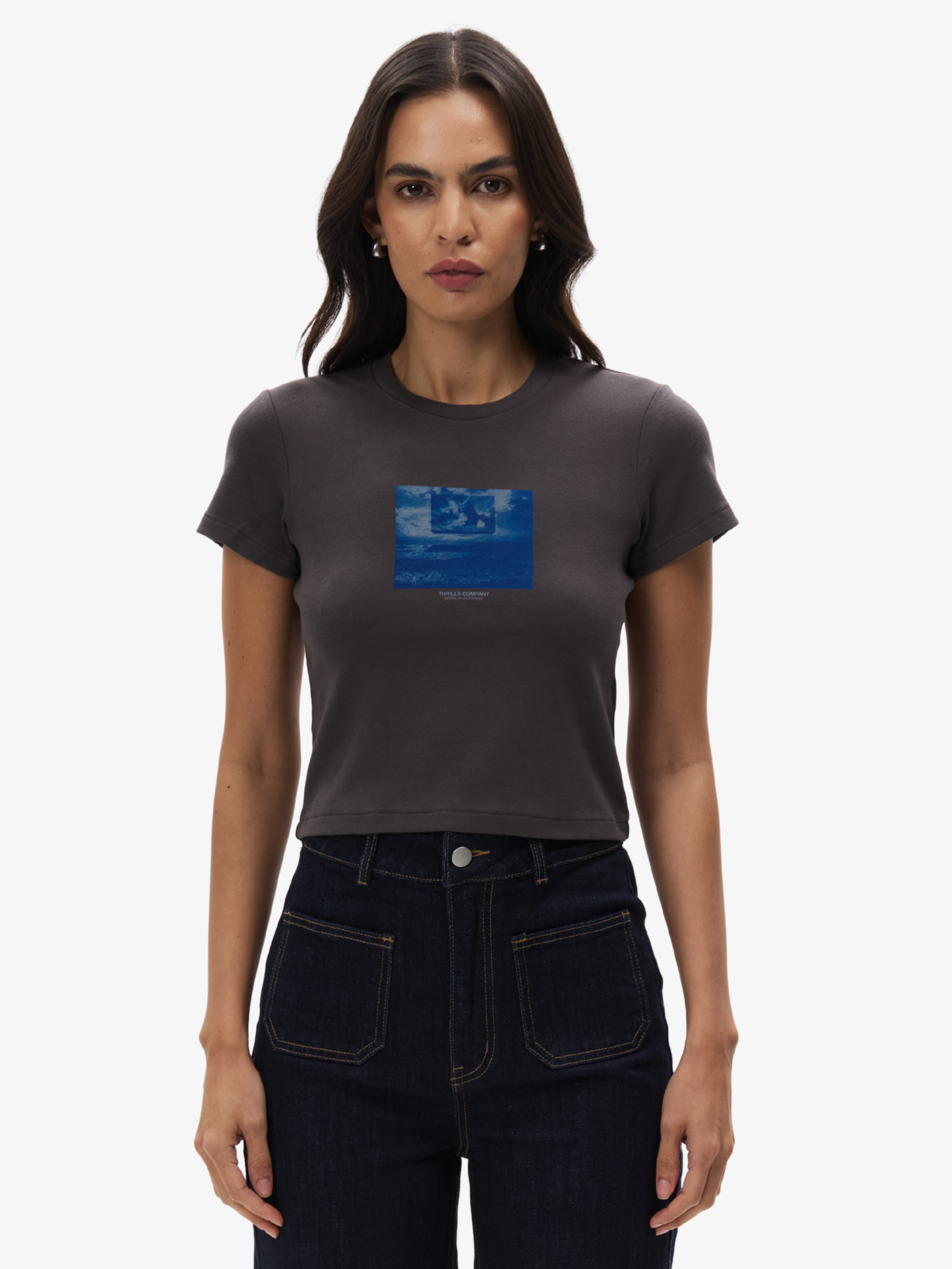 The Future Leap Mini Tee in Merch Black by Thrills features a ribbed crew neck and short sleeves. This tee is designed with a classic silhouette with a contemporary twist.