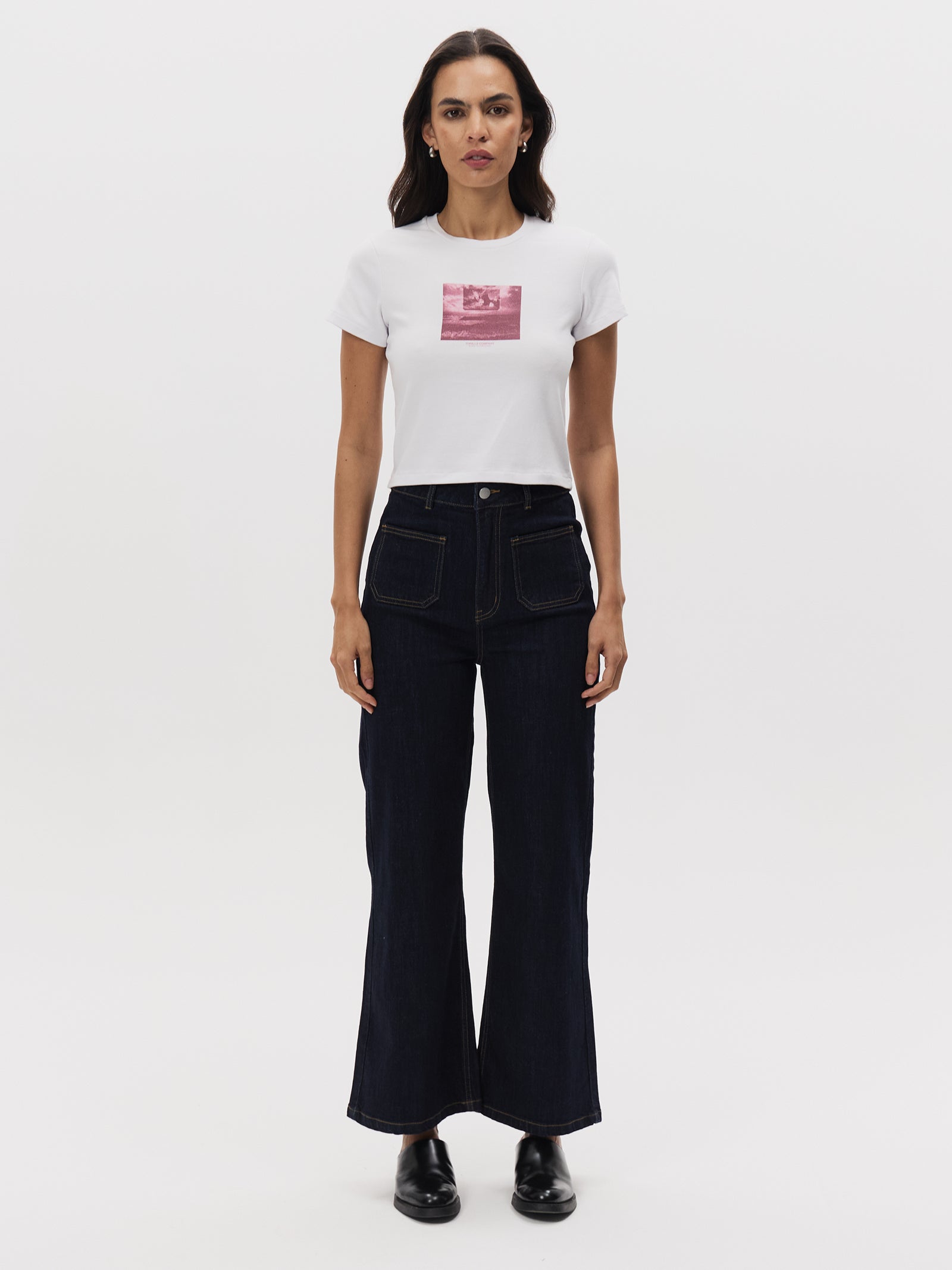 The Future Leap Mini Tee in White by Thrills features a ribbed crew neck and short sleeves. This tee is designed with a classic silhouette with a contemporary twist.