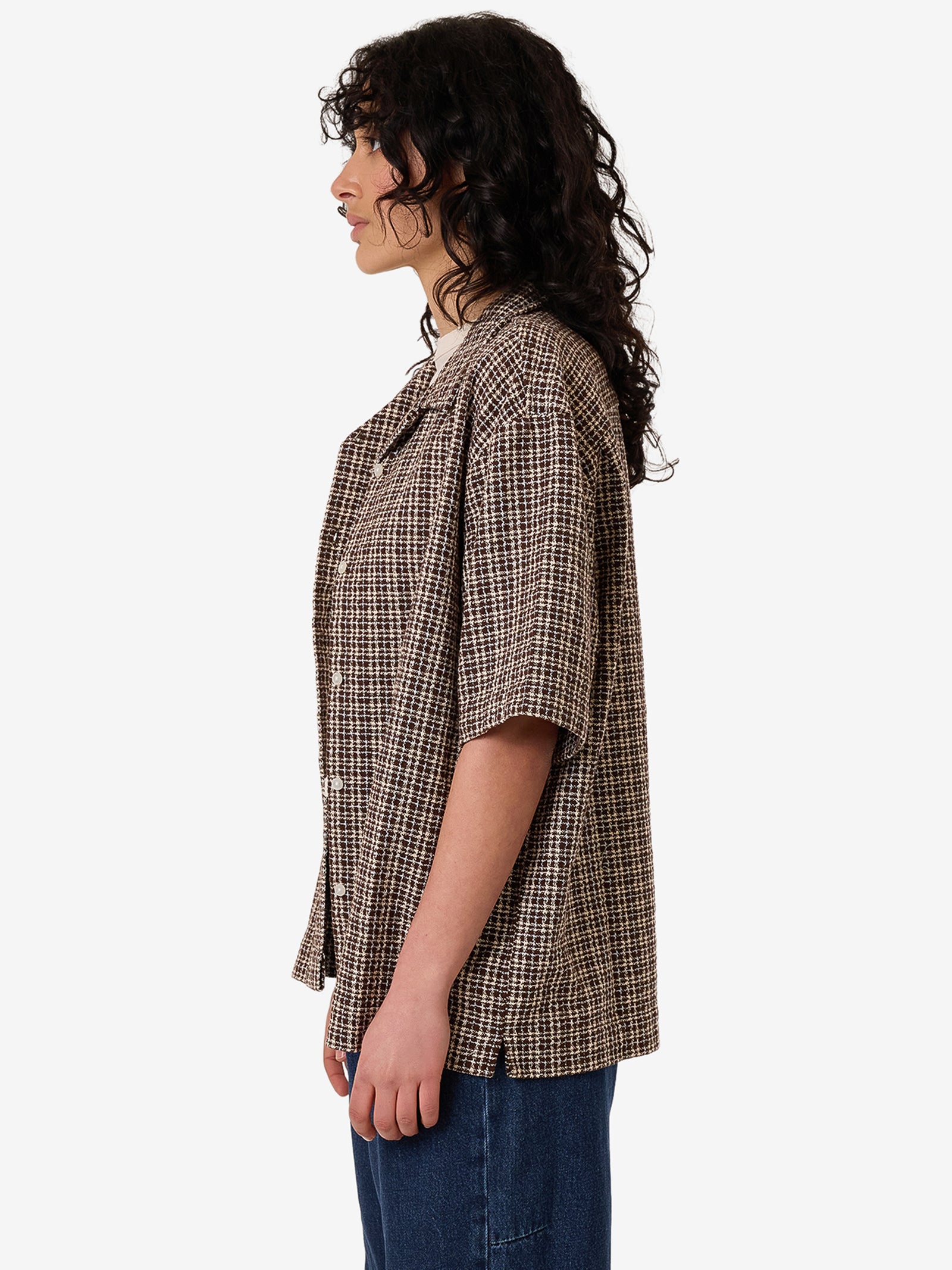 The Hazed Adrianna Shirt in Coffee by Thrills features short sleeves and a subtle check pattern. This full button-up shirt is designed with crisp collars and a textured finish.