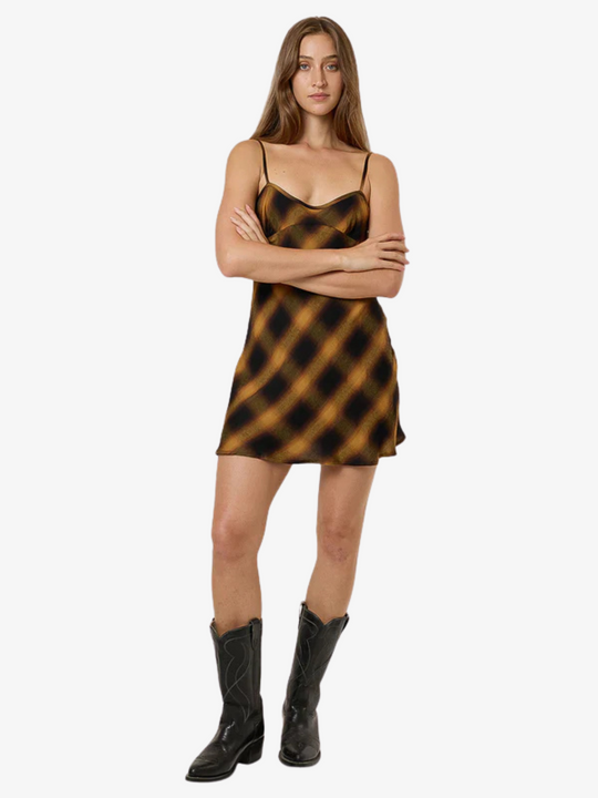 The Lost Signal Mini Dress by Thrills is made from 100% rayon with a lightweight drape that flatters the figure. Featuring a sleek neckline and minimal silhouette, this bronze-toned piece is perfect for summer nights or layered looks.