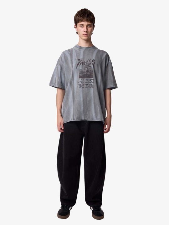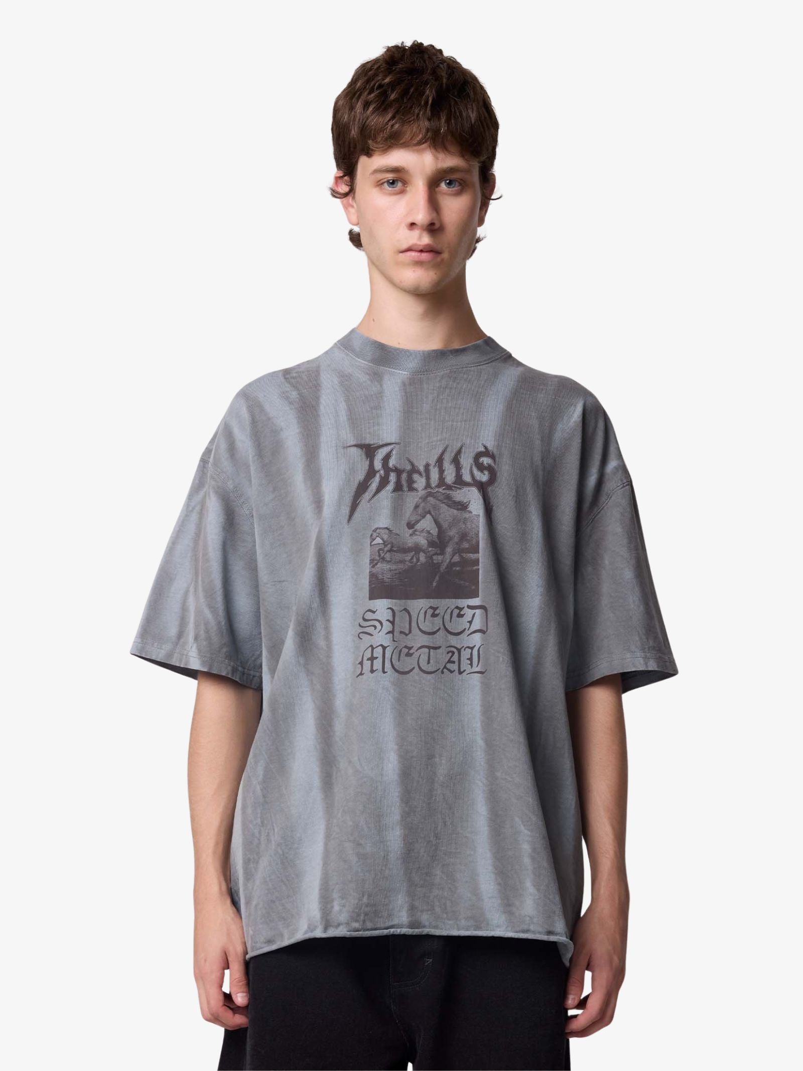 The Rampage Box Fit Oversize Tee by Thrills is made from soft cotton jersey with a unique sunfade wash and designed with a straight, oversized fit. This short-sleeve shirt features a mock neck and a prominent graphic print on the chest with script lettering and a horse image, giving it a heavy music aesthetic.