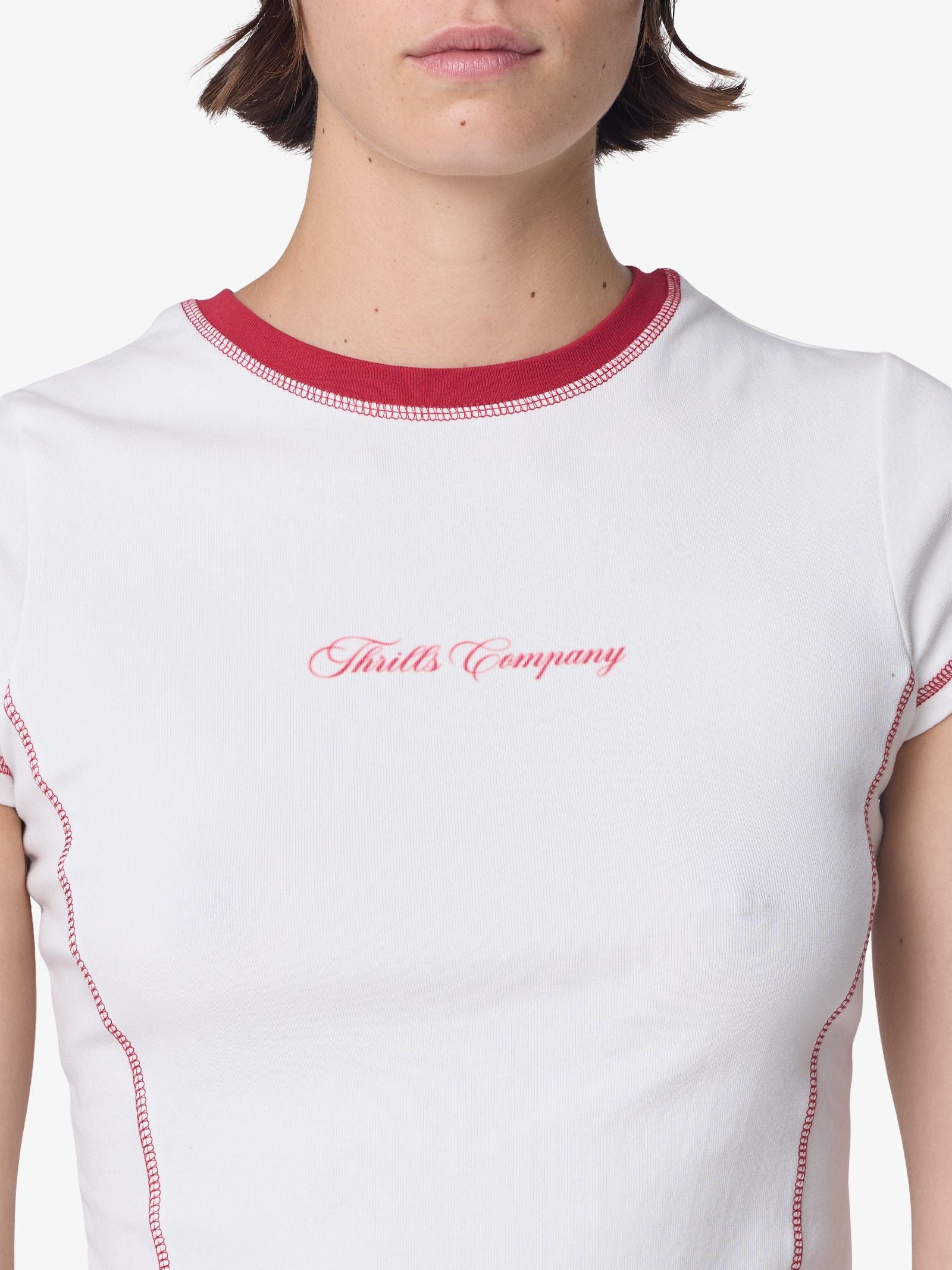The Suspended Club Tee from Thrills is cut from organic cotton fine rib with added stretch for a slim, long-line fit. It features cap sleeves, contrast panel detailing with cover stitching, a contrast neck band, and a centre front graphic print.