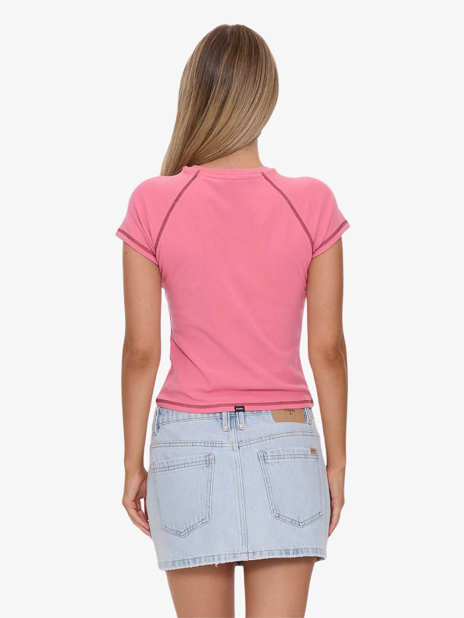 The Track Record Raglan Club Tee by Thrills is a slim-fit tee crafted from a heavy 280gsm fine-rib organic cotton blend. This top features raglan sleeves, contrast topstitching, and a body-skimming silhouette. It is detailed with a sporty front chest graphic and a classic crew neckline.