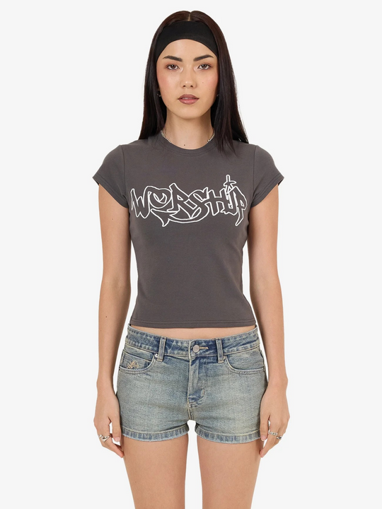 Own your Y2K aesthetic in the Throws Cap Sleeve Tee by Worship. With a lived-in wash, thick ribbed cotton, and a cropped silhouette, this graphic tee pairs perfectly with jorts or slouchy denim.