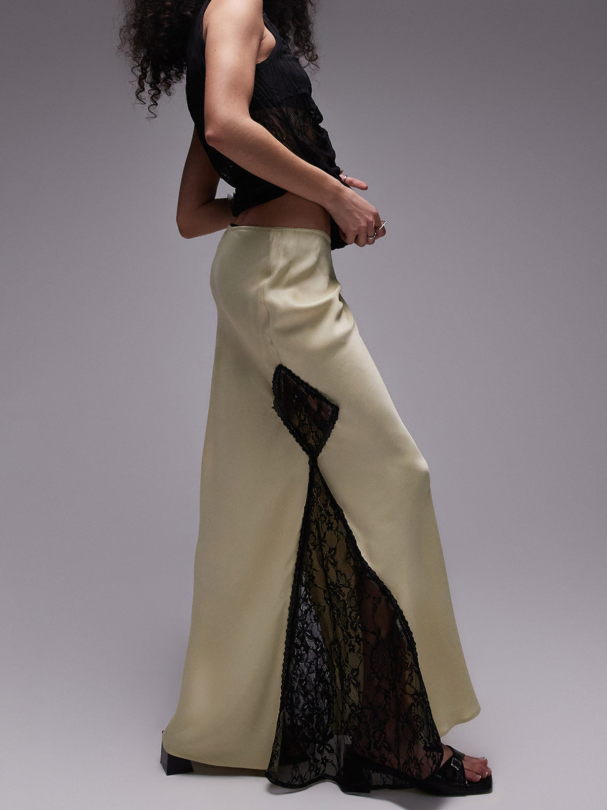 The Co-Ord Satin Lace Mix Midi Skirt by Topshop exudes elegance with its soft satin finish and delicate lace inserts. Designed with a mid-rise, elasticated waist, this skirt offers both comfort and a refined, feminine silhouette.