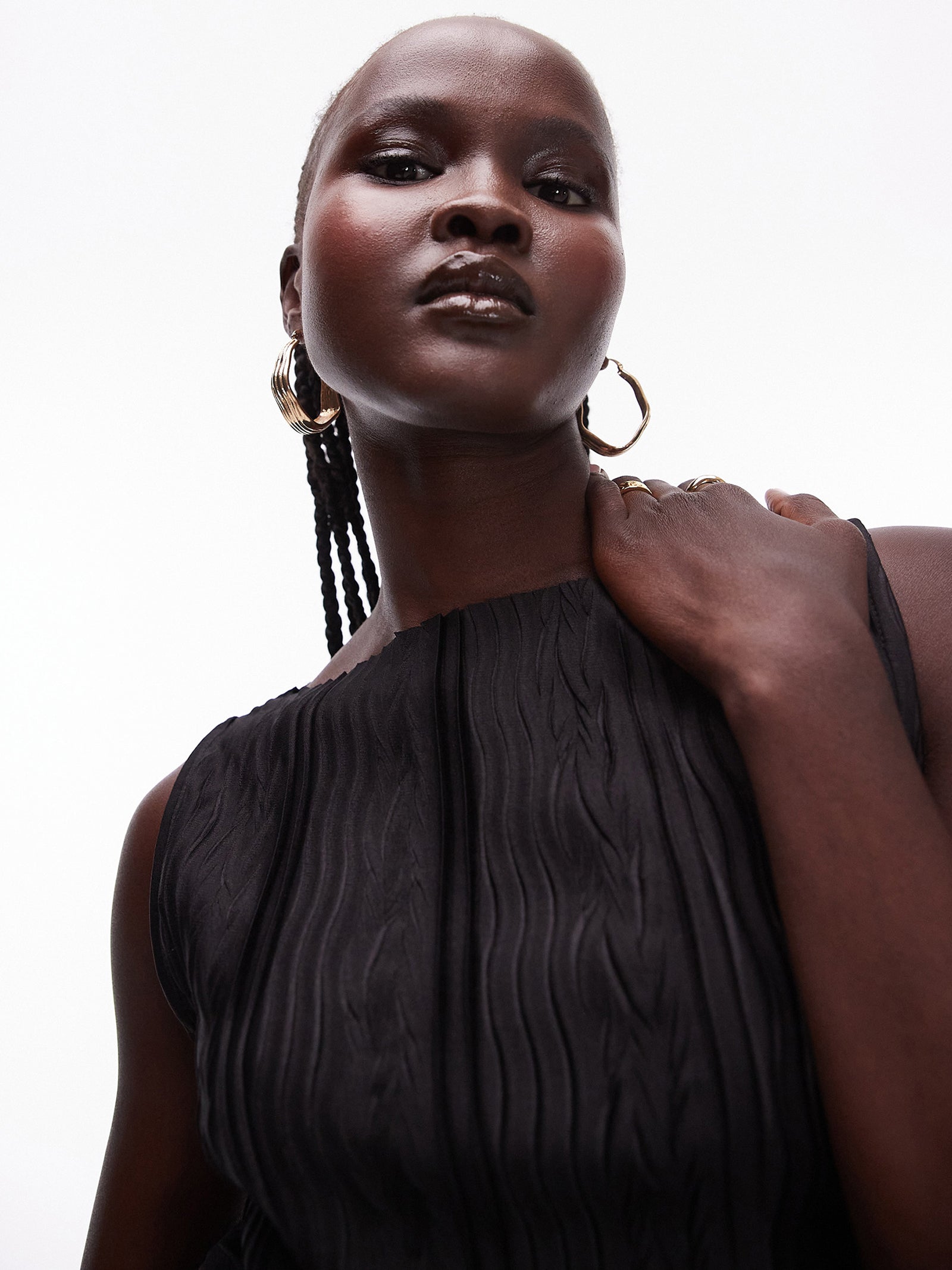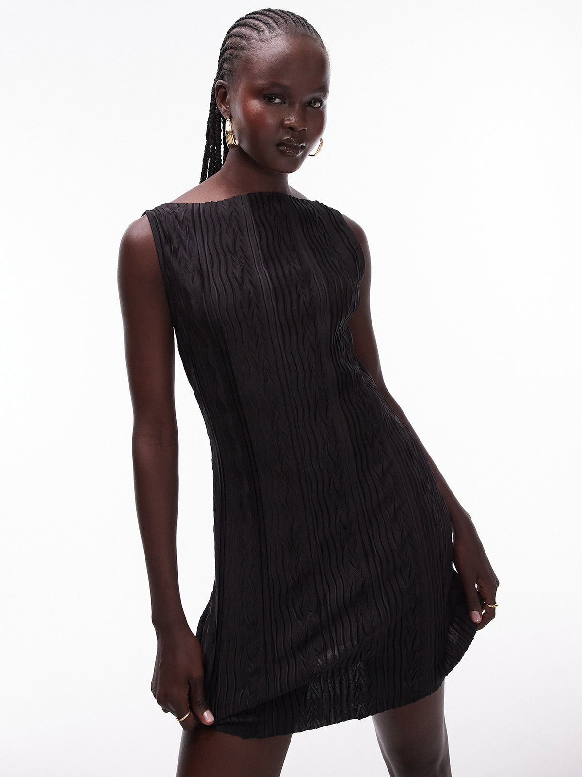 Effortless and chic, the Topshop Crinkle Plisse Mini Dress in black features a refined boat neckline and a sleek sleeveless design. With its regular fit and textured finish, this piece is perfect for elevating your wardrobe with contemporary elegance.