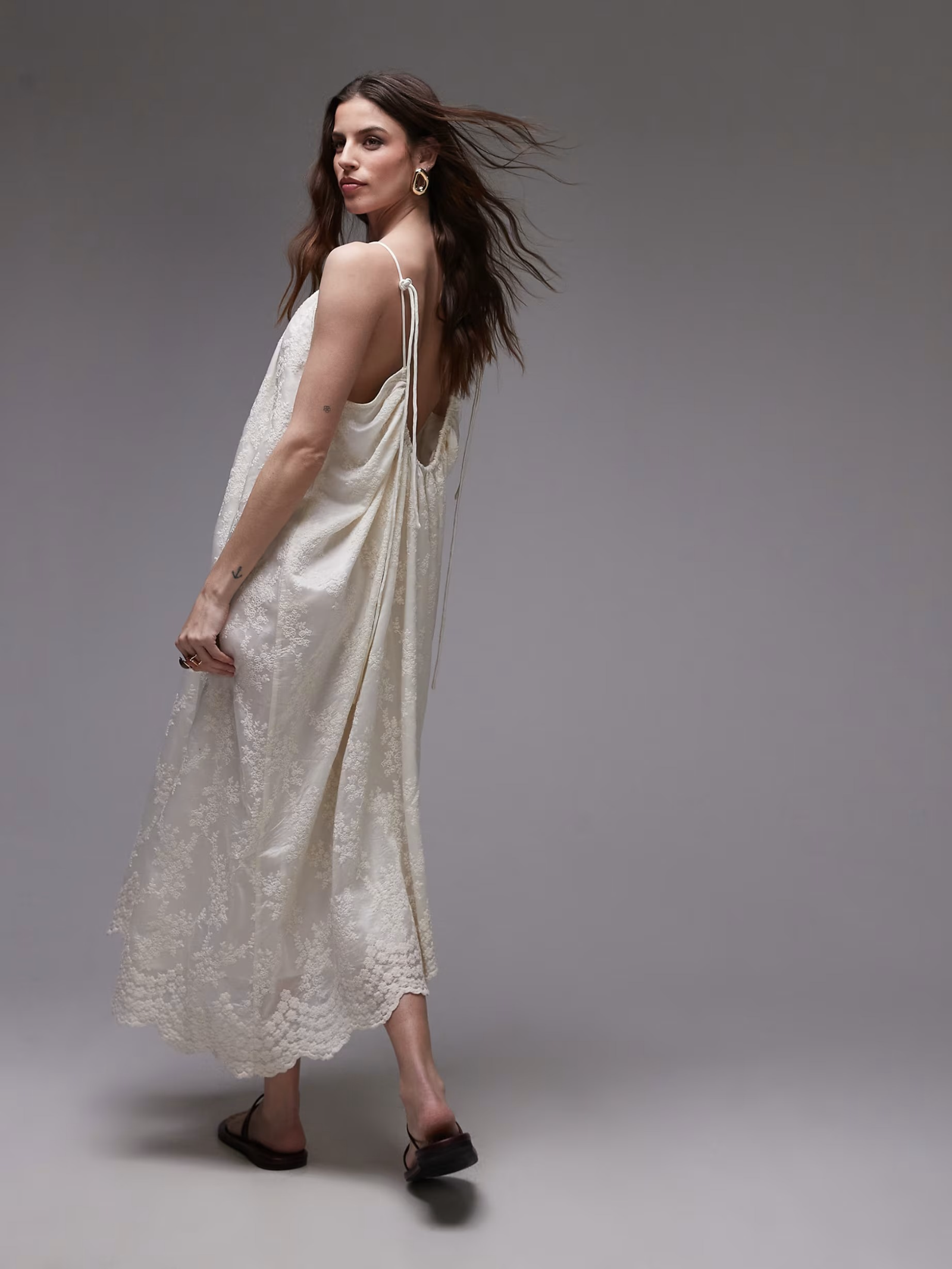 This Embroidered Midi Dress by Topshop brings delicate floral embroidery to a breezy, oversized silhouette. Designed with a scoop neck and tie straps for adjustable comfort, this dress is perfect for warmer days.