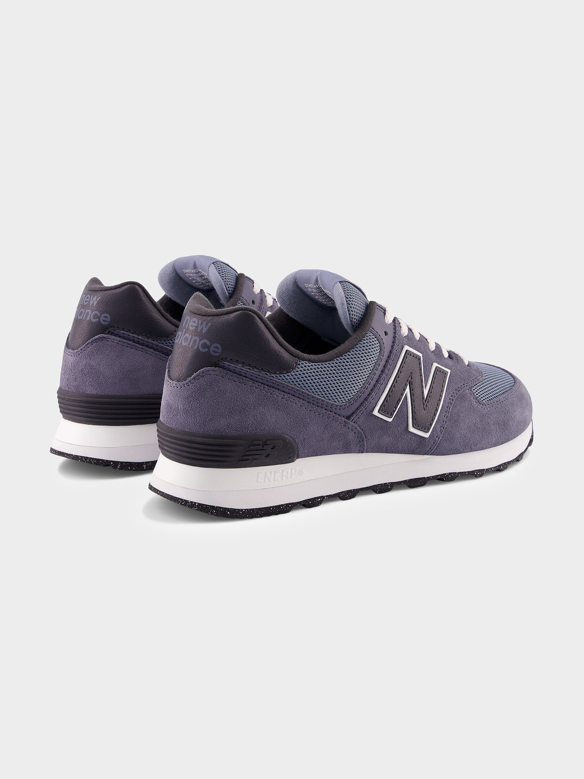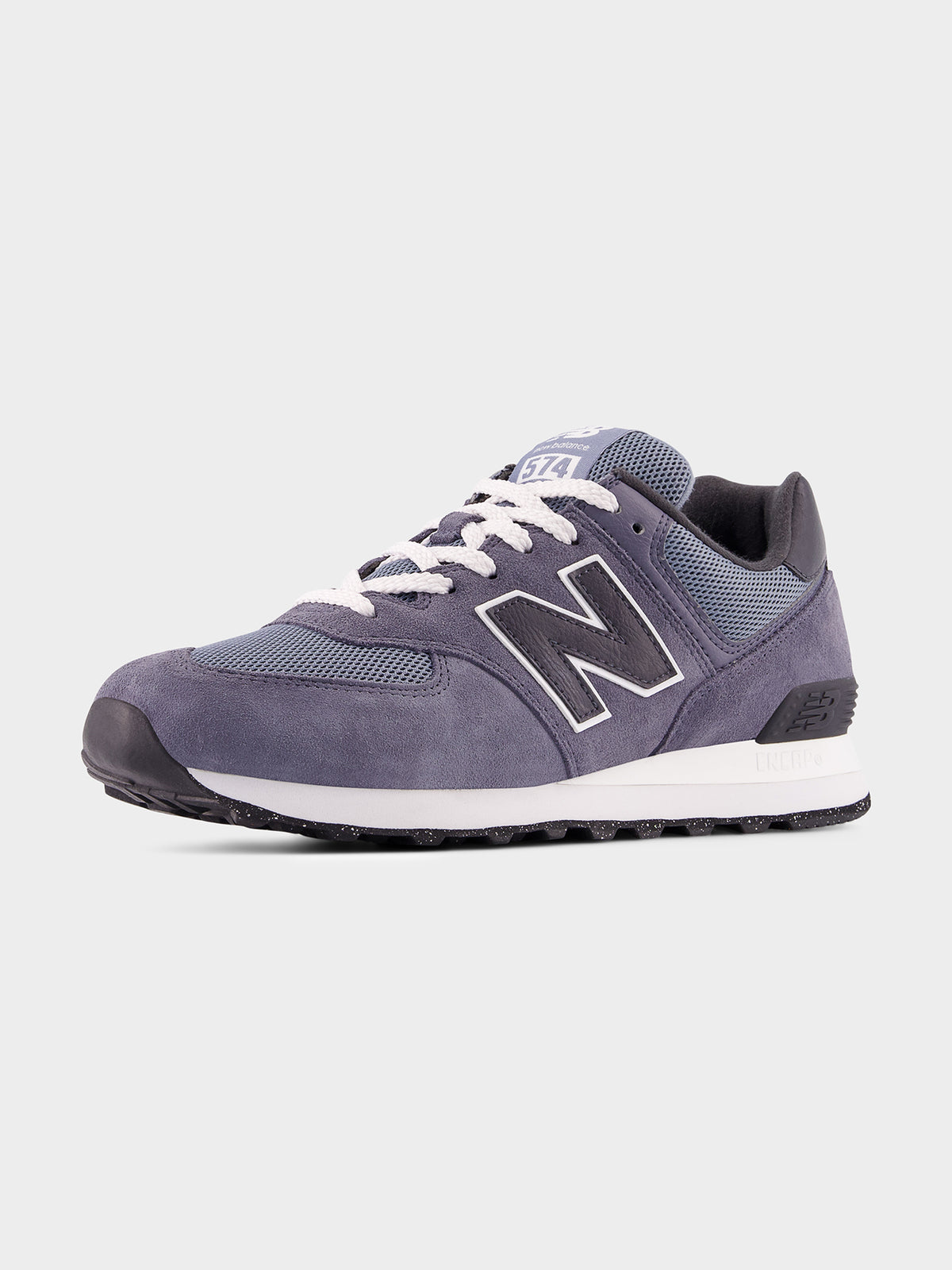 The grey Low-top 574 Sneaker features a mesh and suede upper, with recycled materials used for the vamp, collar, and tongue. The ENCAP midsole provides long-lasting comfort, while the rubber outsole is made from 5% recycled materials. Branding is visible throughout the design.