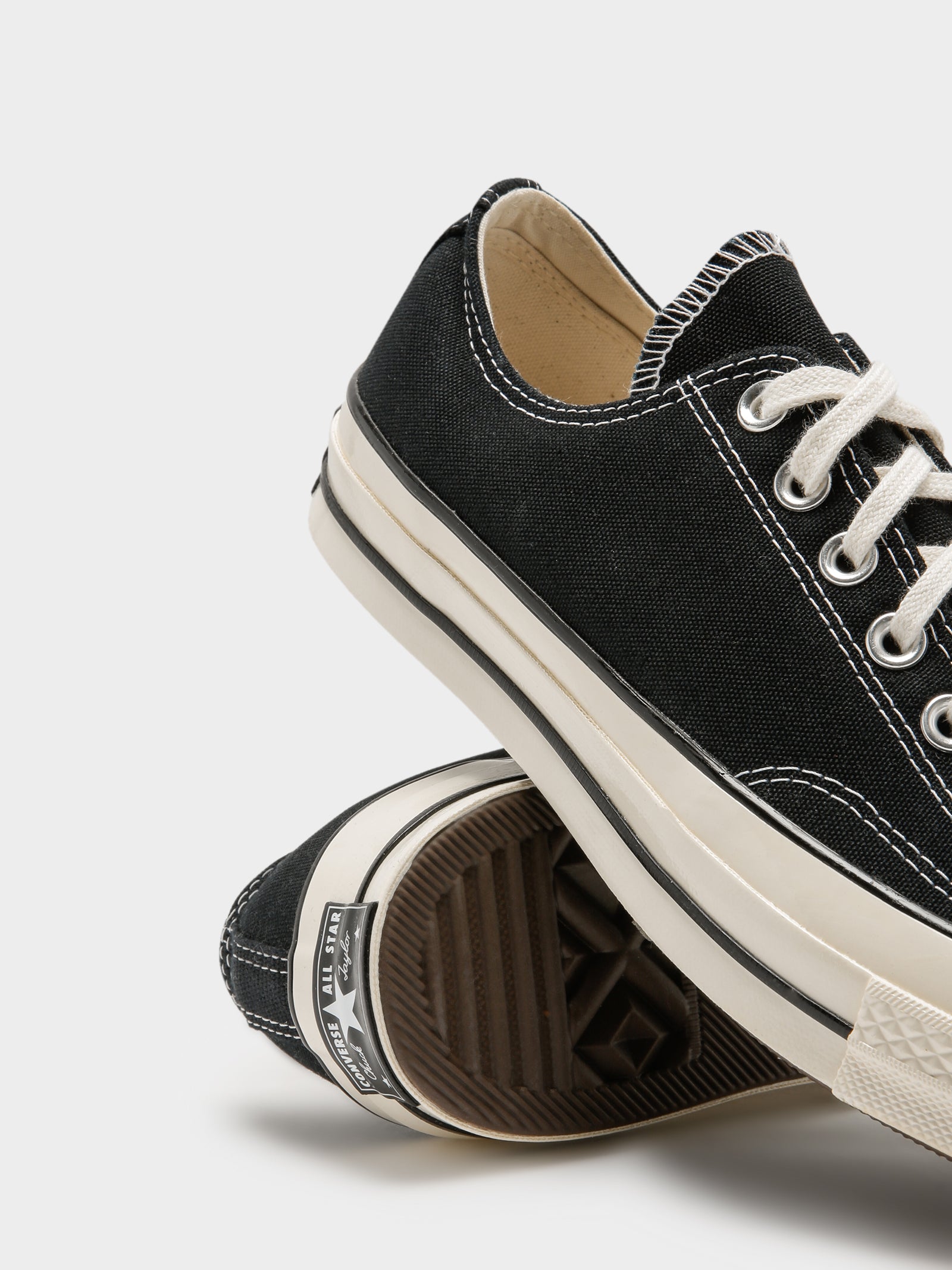 The Chuck Taylor All Star 70 Low Top Sneakers by Converse feature a durable black canvas upper with classic lace-up styling. Signature heritage details and branded license plates on the midsole complete the iconic look.