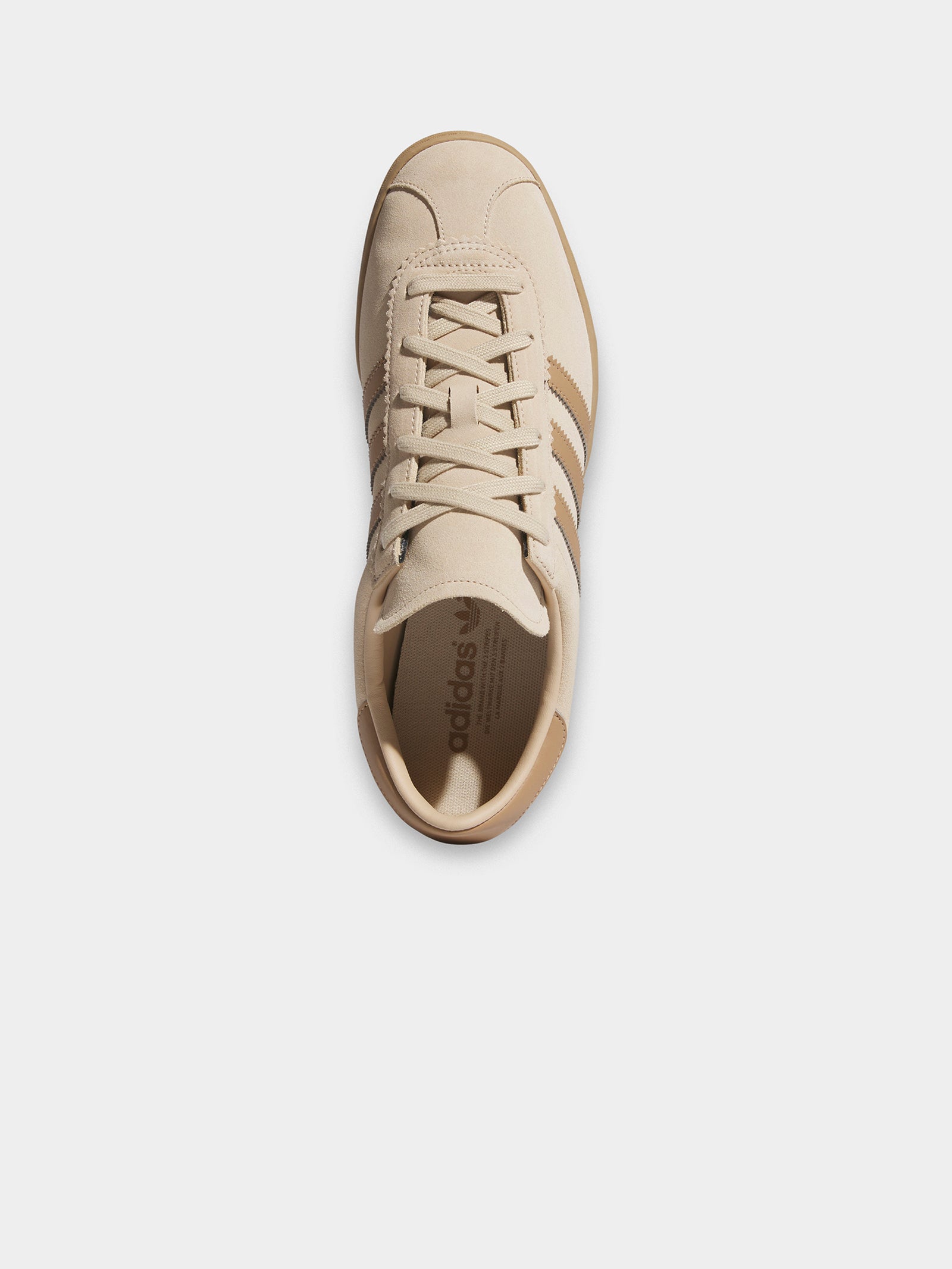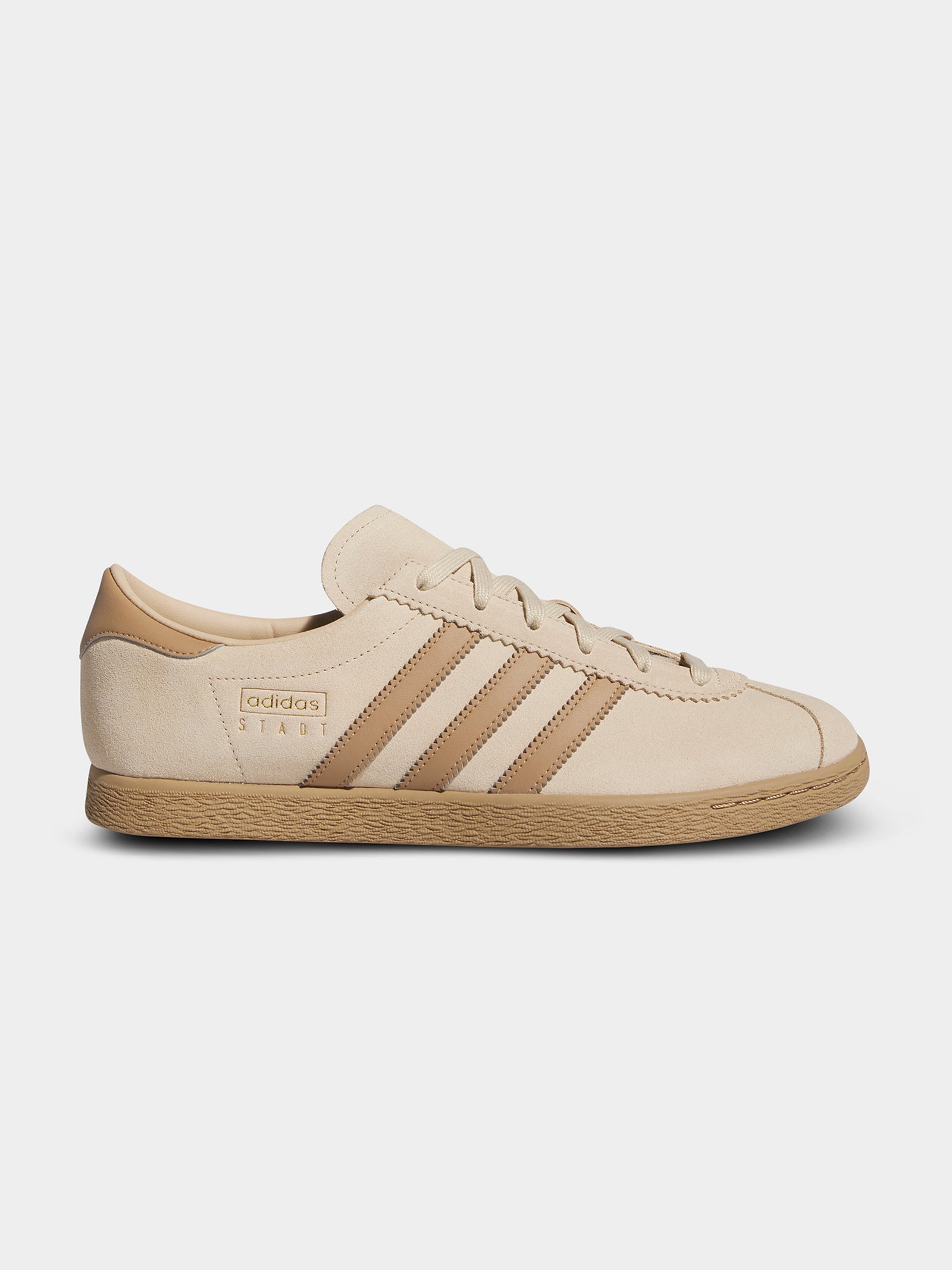 The Stadt Sneaker in Magic Beige/Cardboard/Gold Met by Adidas is crafted with premium leather and synthetic overlays. This shoe features a thin sole, EVA outsole, and soft fabric lines.