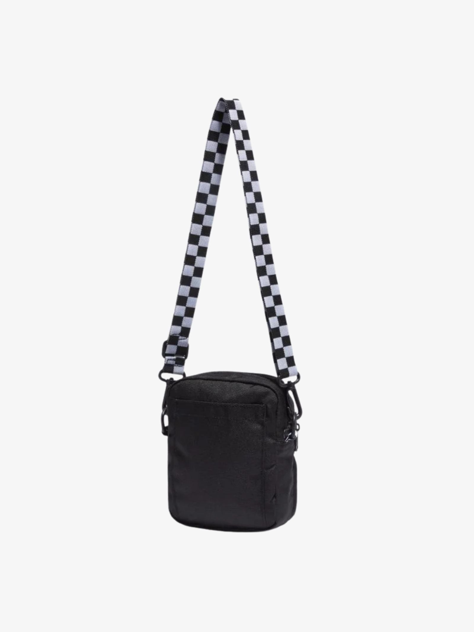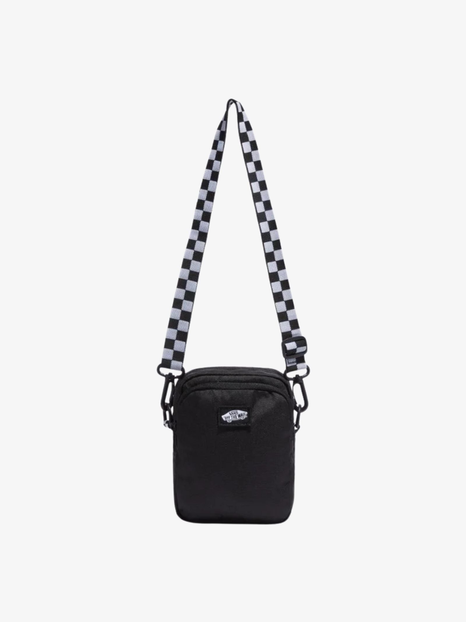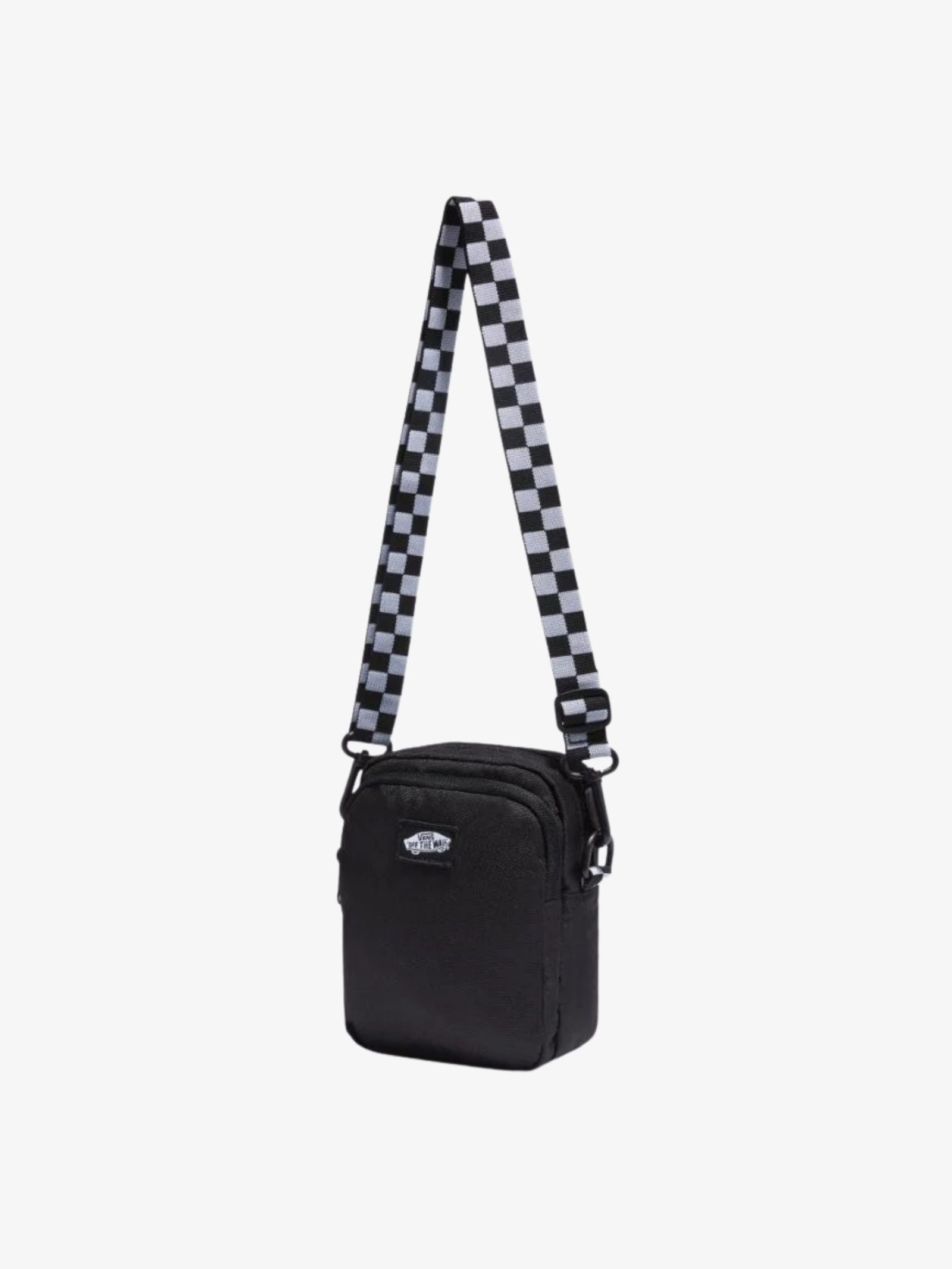 The Go Getter Crossbody Bag by Vans is a compact fashion bag designed for essential carry. It features a distinctive adjustable checkerboard strap and a classic Vans logo patch on the front. Storage is optimized with an exterior zip pocket and a dedicated phone pocket at the back.