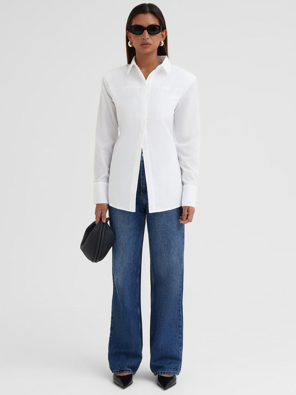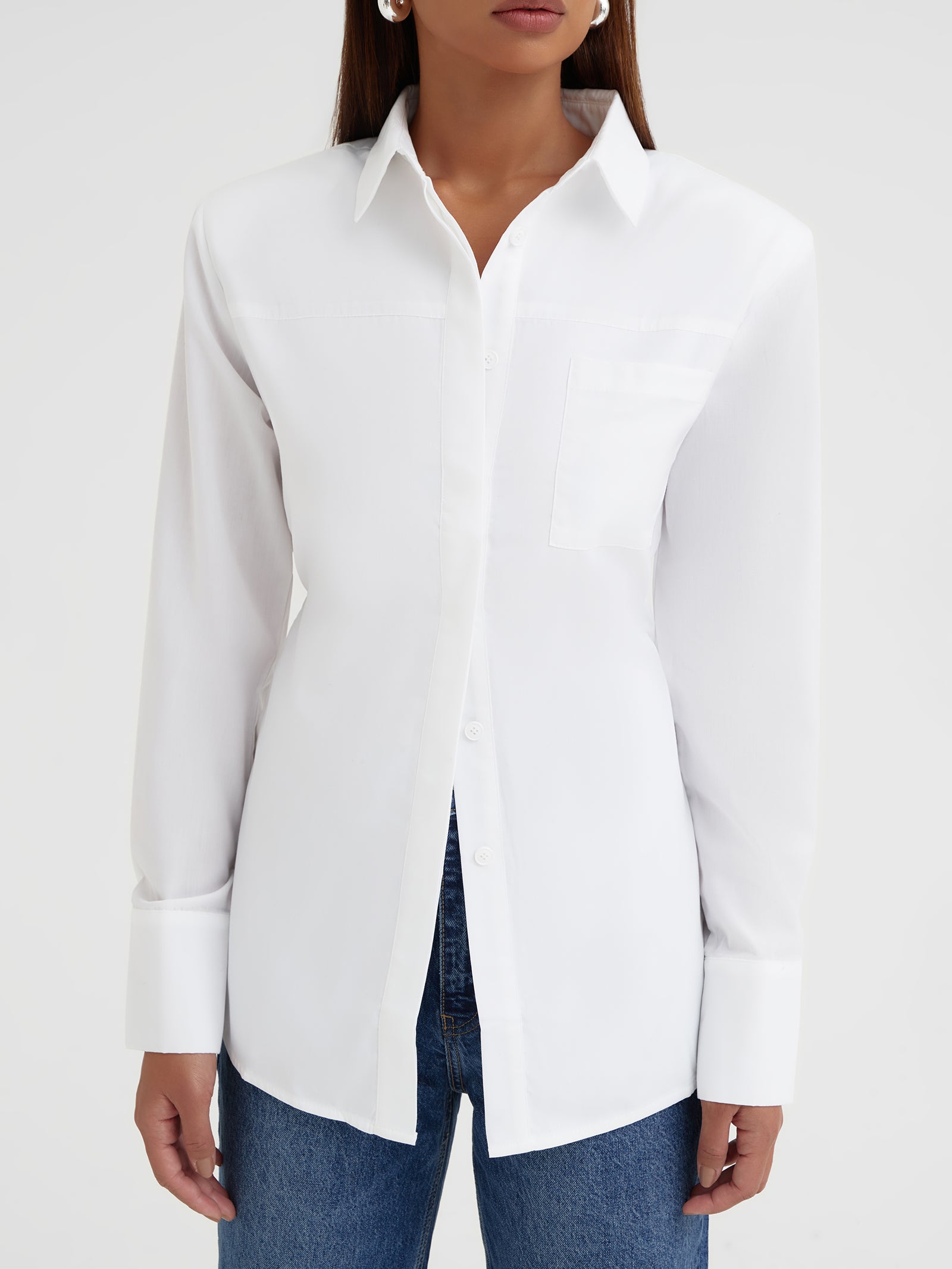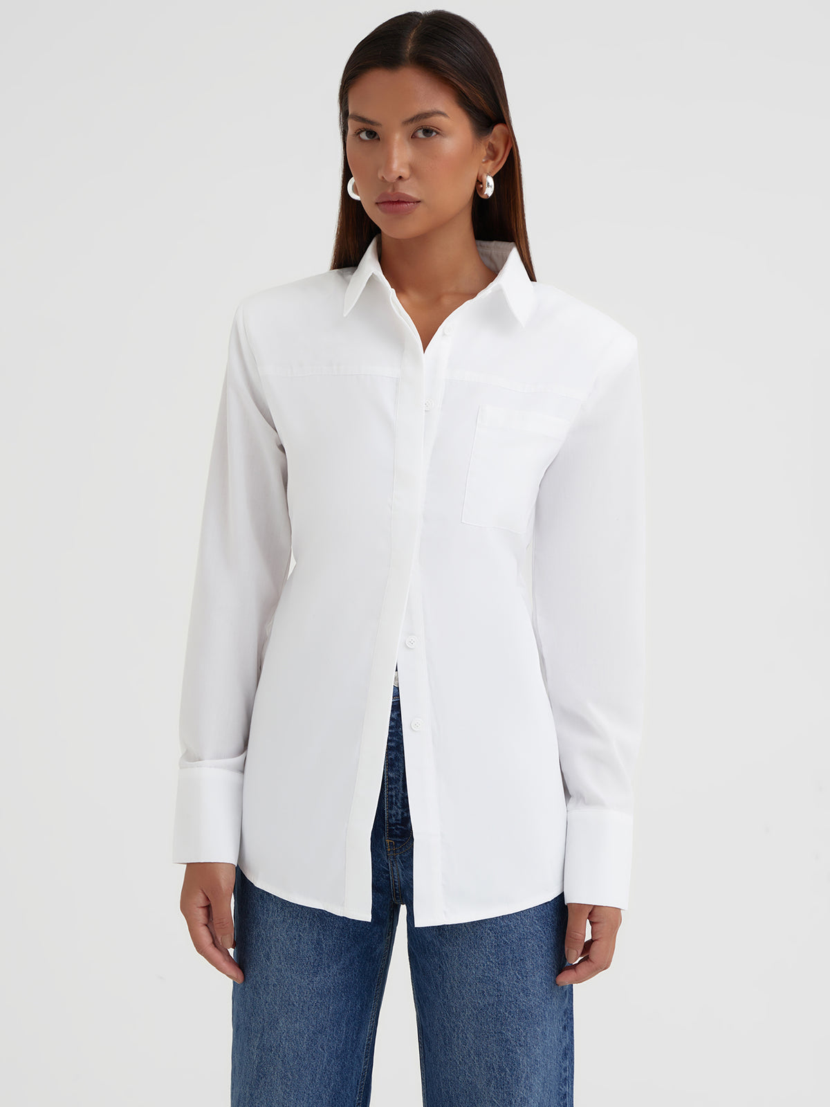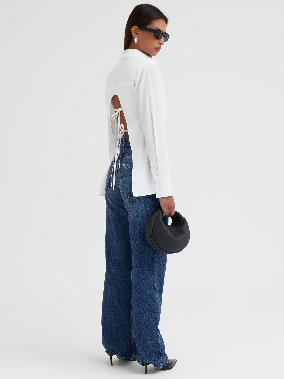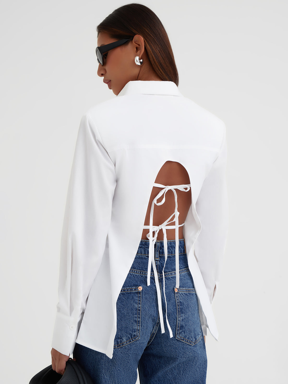 The Vienna Shirt in white offers a tailored silhouette and slim fit, with an open tie back for added style. The button front fastening ensures a secure fit. Fits true to size for a polished look.
