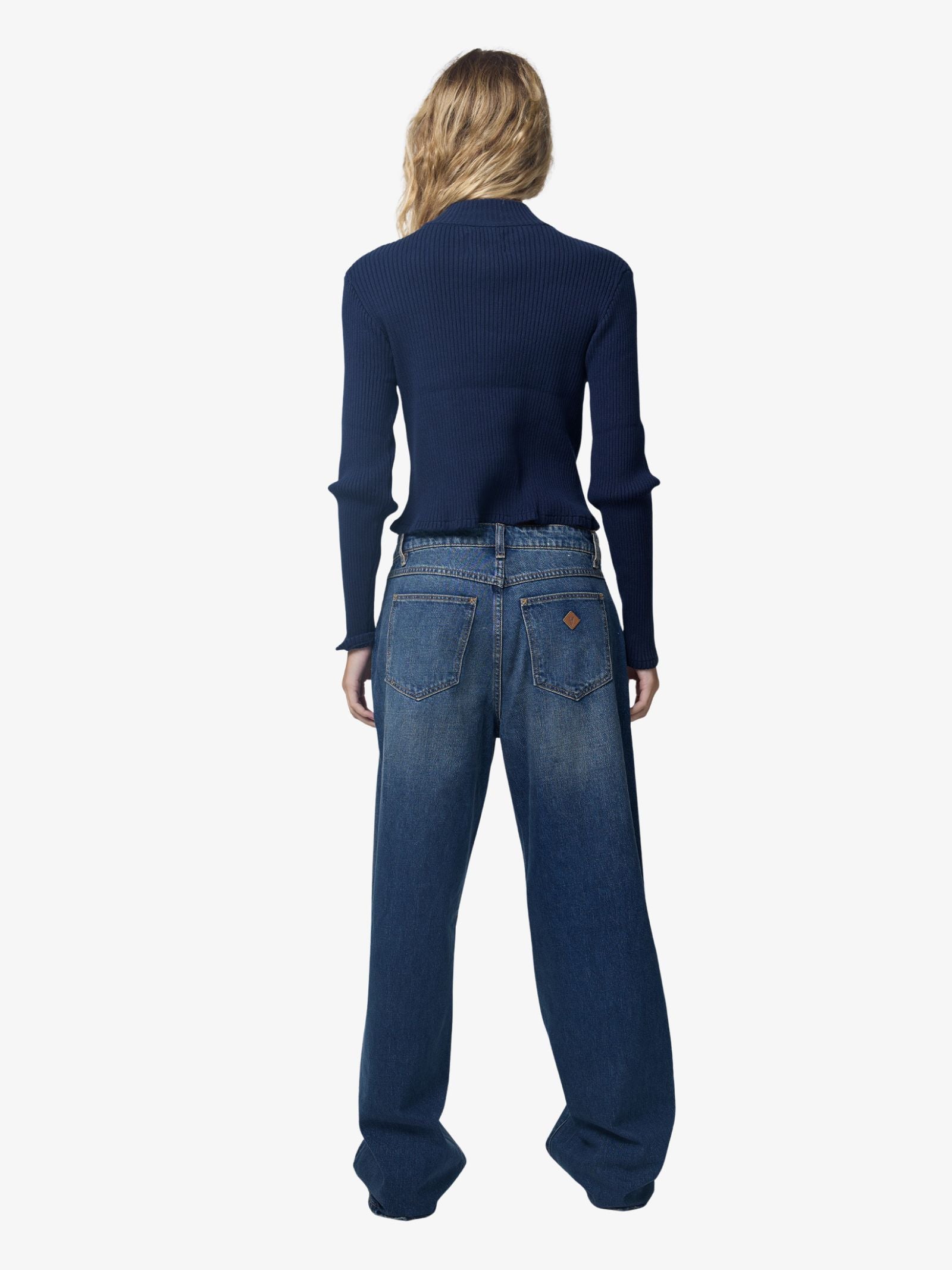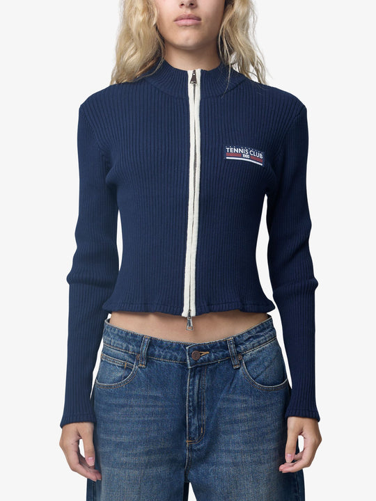 The 1995 Tennis Club Knitted Jacket by WHSC is a fitted, long-sleeve crop top in a navy blue ribbed knit, featuring a high mock neck and a full-length contrast white zipper. The top is detailed with a small "TENNIS CLUB" graphic patch on the chest and a subtle lettuce-edge hem.