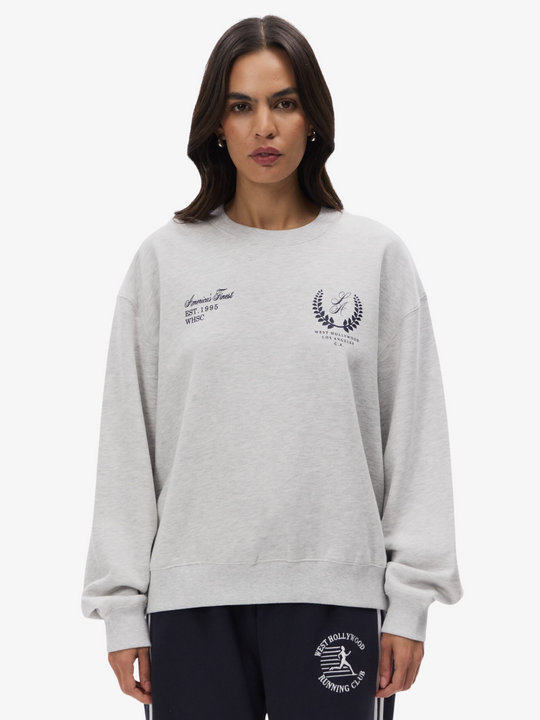 The Americans Finest Crewneck in Snow by WHSC is designed in a relaxed silhouette. This crew features embroidered varsity-style graphics, long sleeves and cuffed hems.