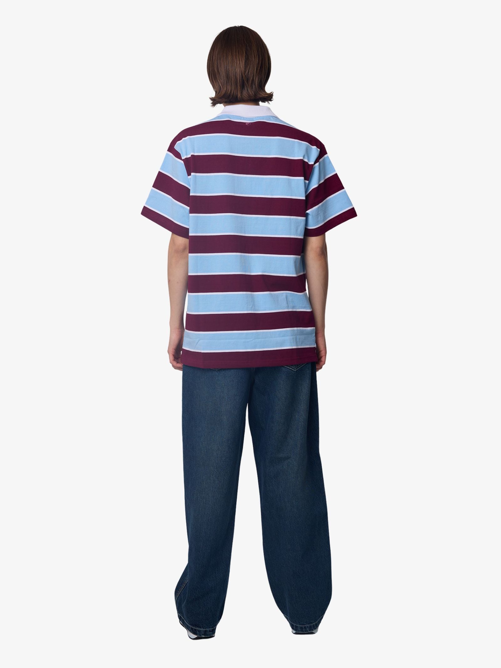 The Belter Box Fit Polo by Worship is made from soft cotton knit fabric and designed with a straight, relaxed fit. This short-sleeve shirt features wide, contrasting horizontal stripes, a white collared neck, and a small embroidered logo on the chest.