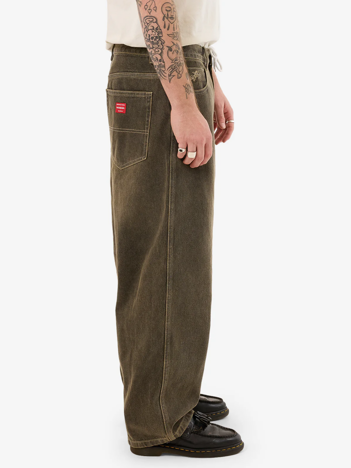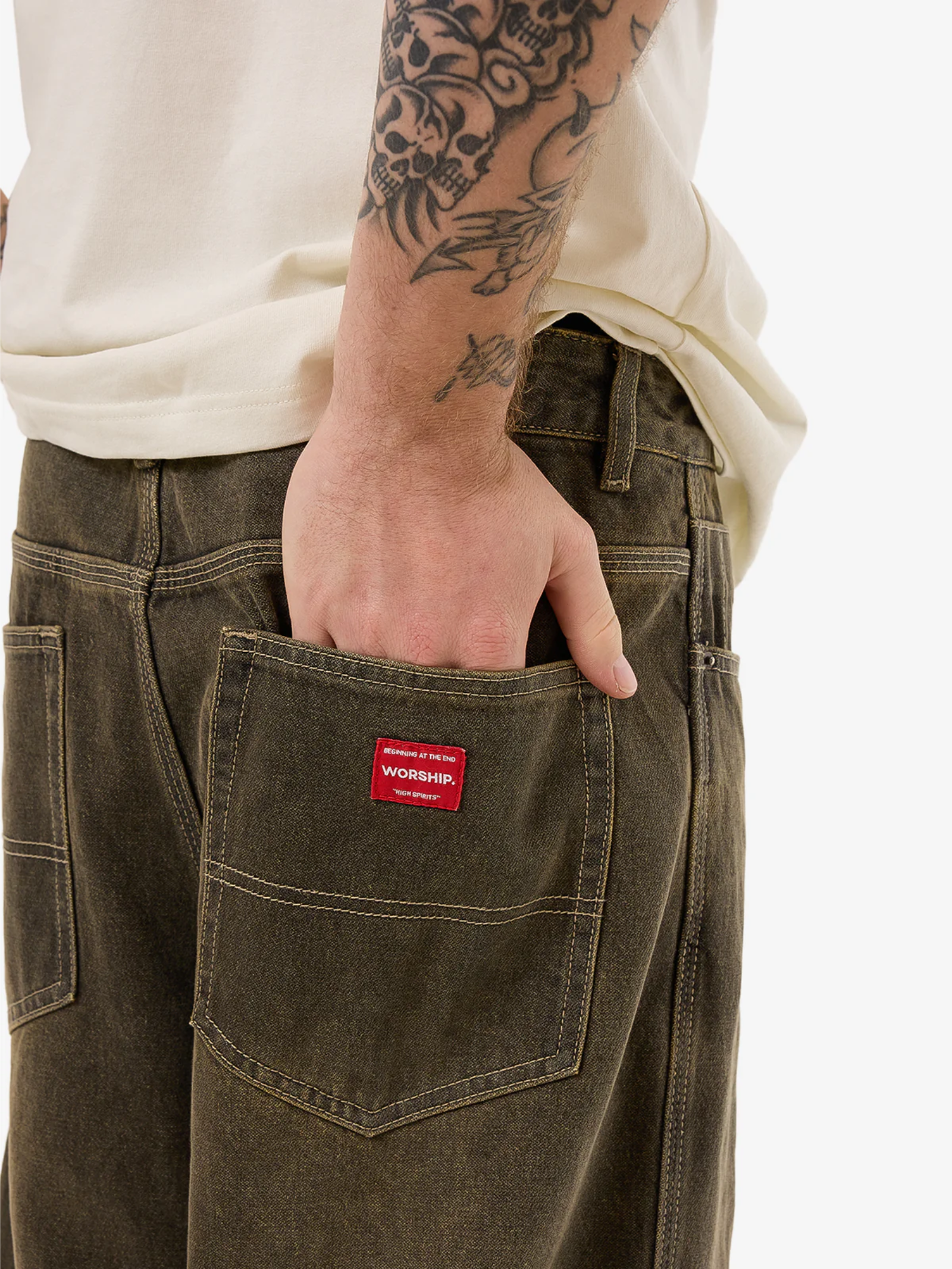 The Big Dawg Jean in Smokestorm by Worship is crafted from durable 13oz cotton broken twill denim. This jean offers a relaxed, oversized fit, complemented by classic five-pocket styling and a faded wash.