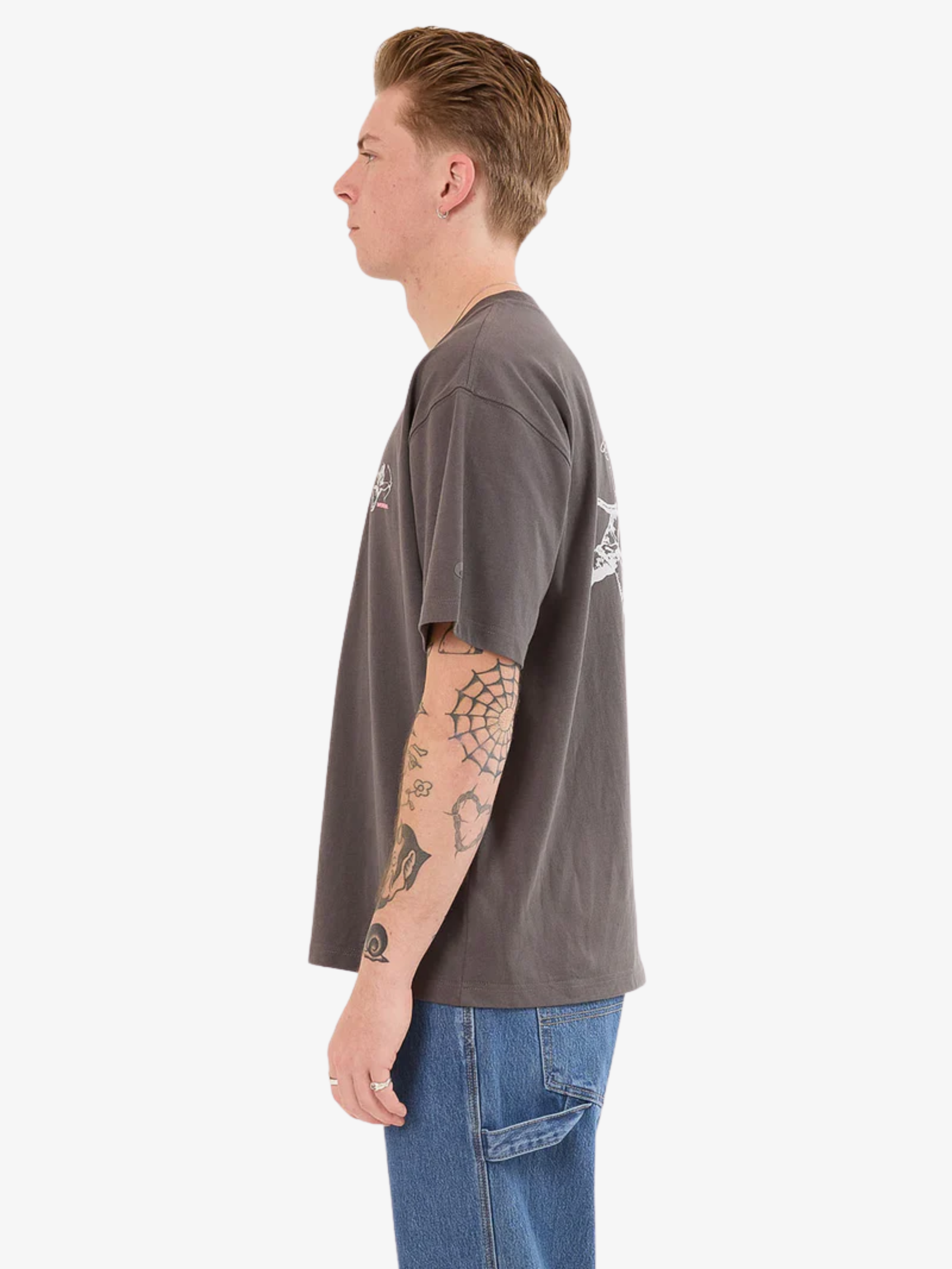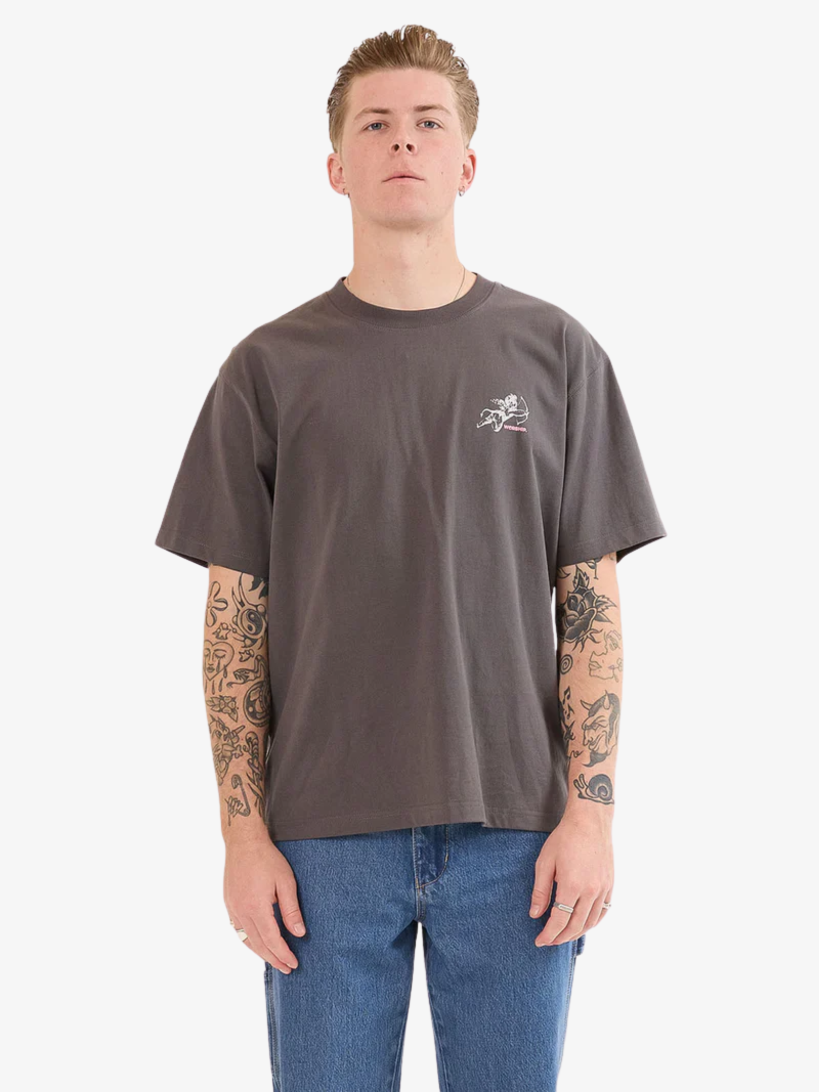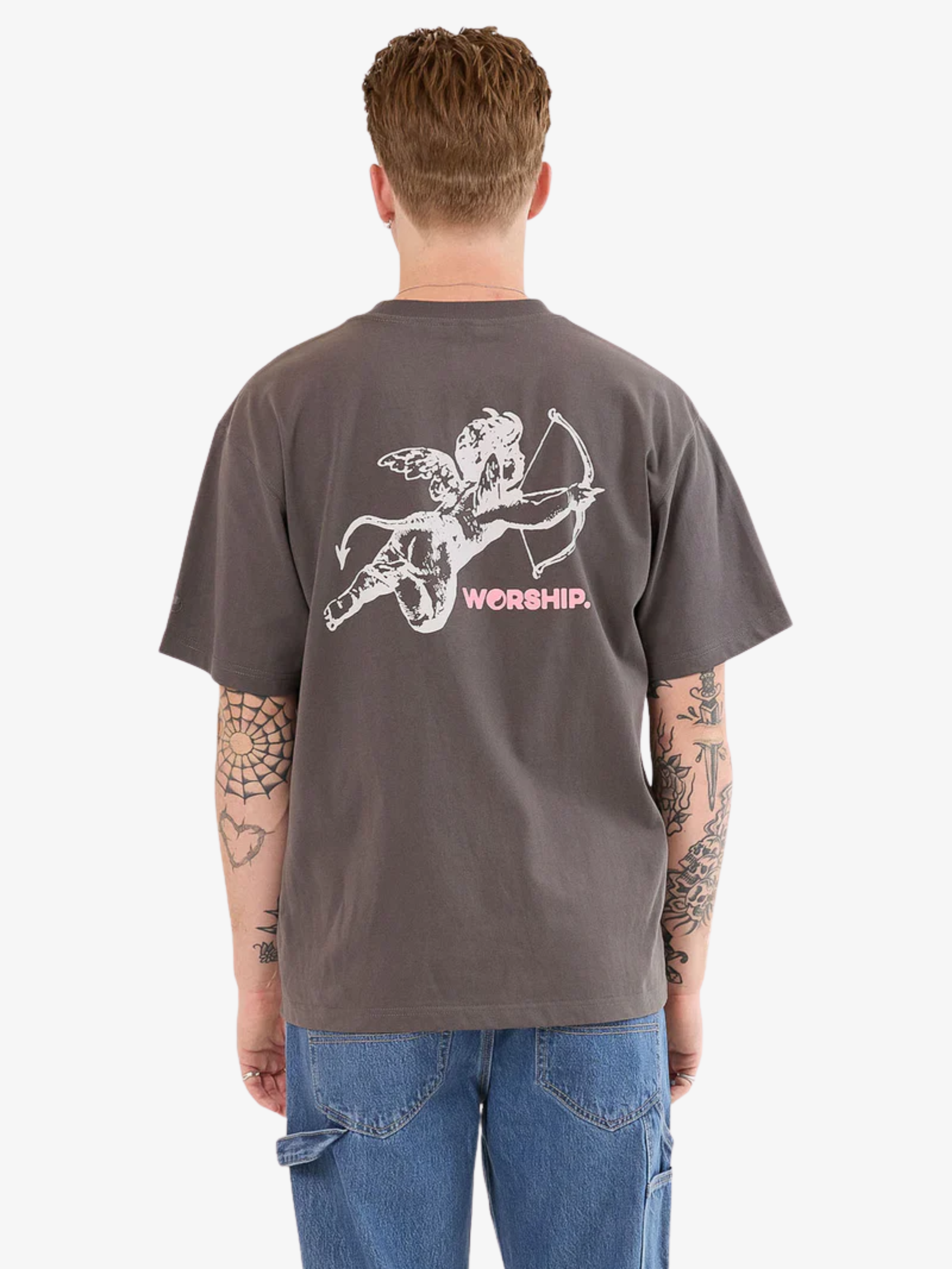 The Cherub Tee in Worn Black by Worship is made from heavyweight 245gsm cotton jersey. This tee features dropped shoulders, and signature cherub artwork is screen-printed front and back.