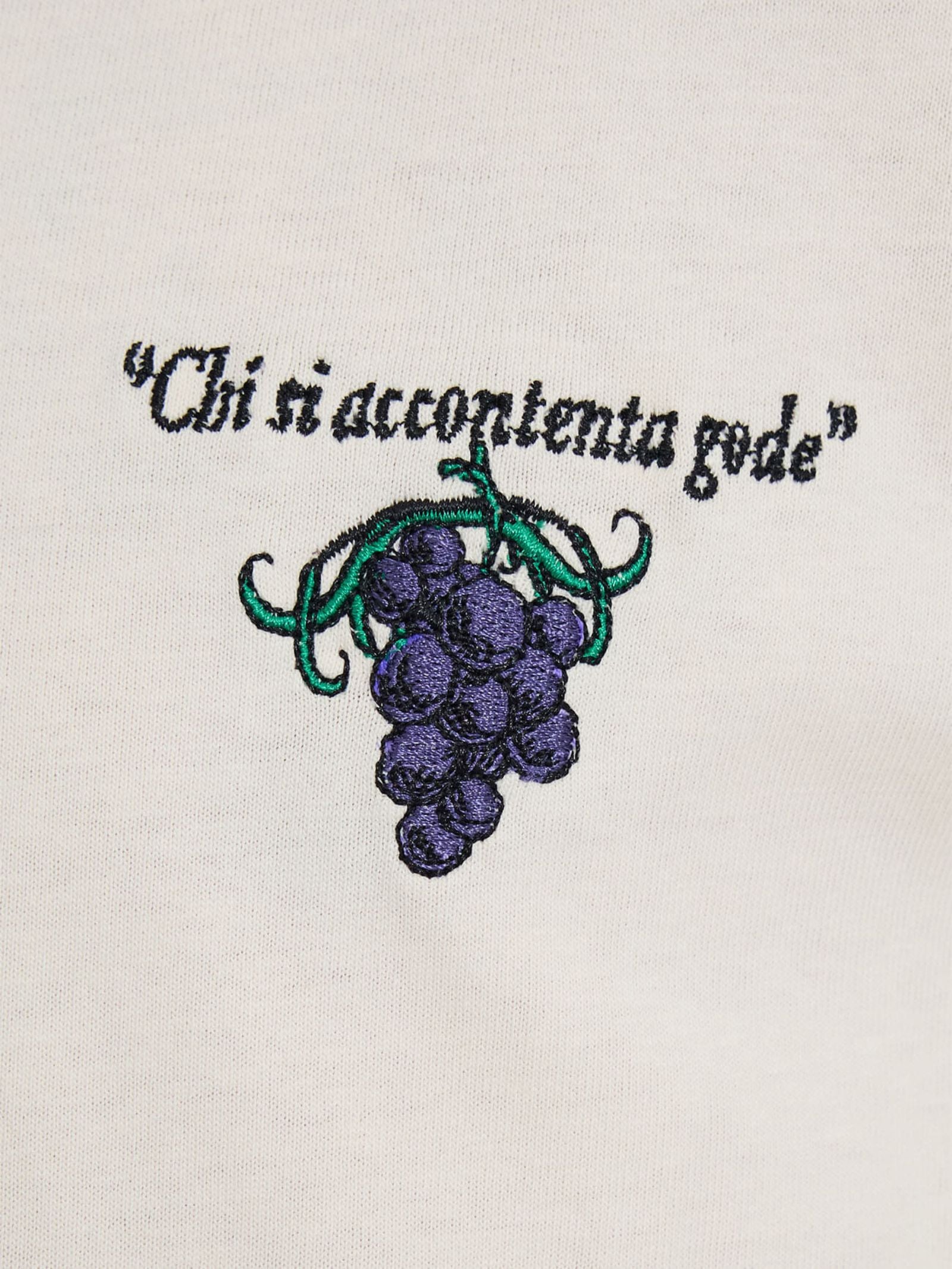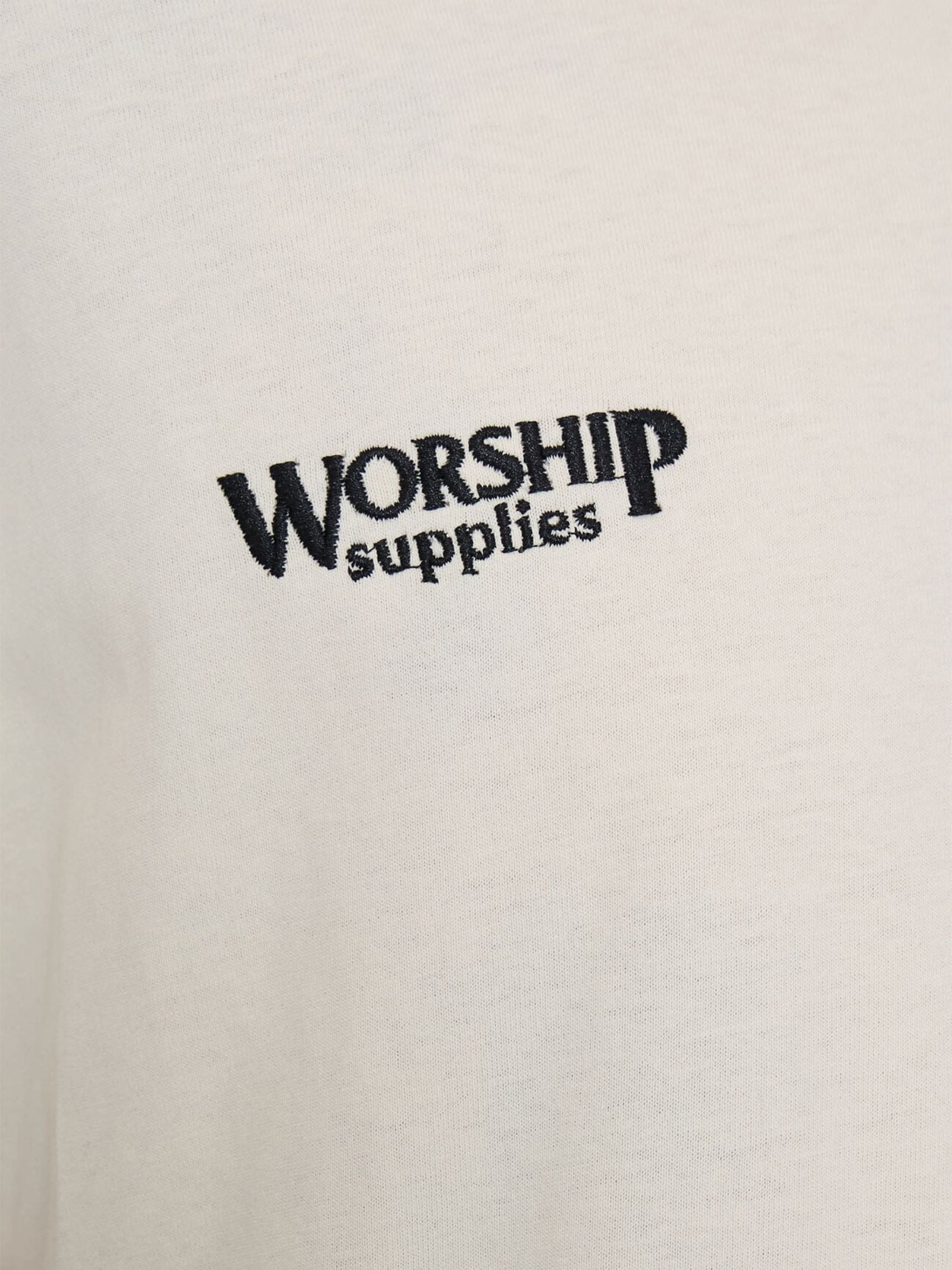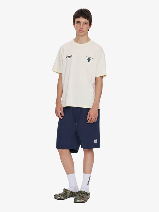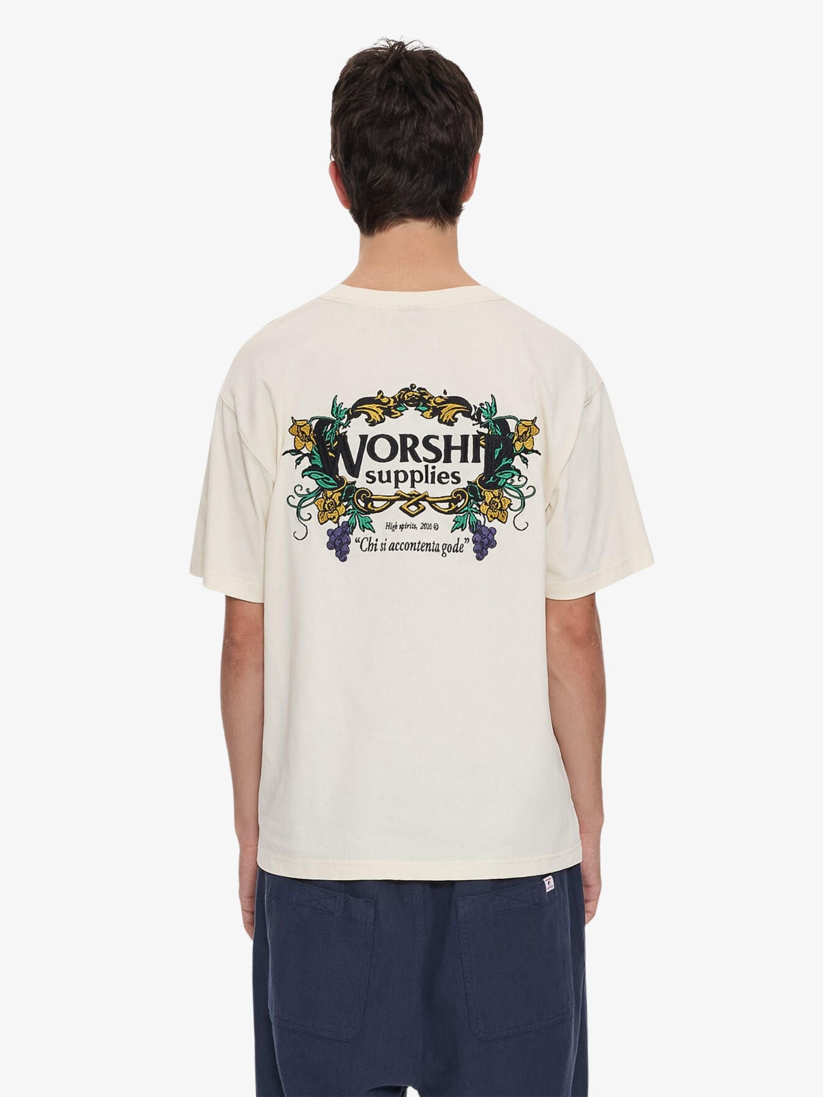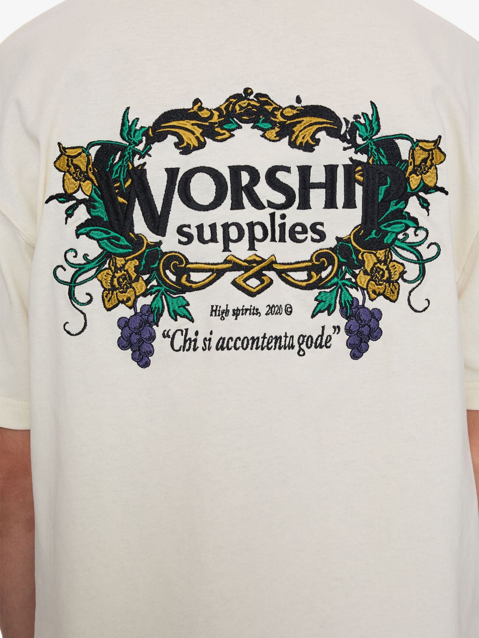 The Feast Tee by Worship is a short-sleeve t-shirt with a relaxed, oversized fit. The t-shirt features embroidered grape cluster graphics on the chest and a large, elaborate embroidered crest graphic across the back.