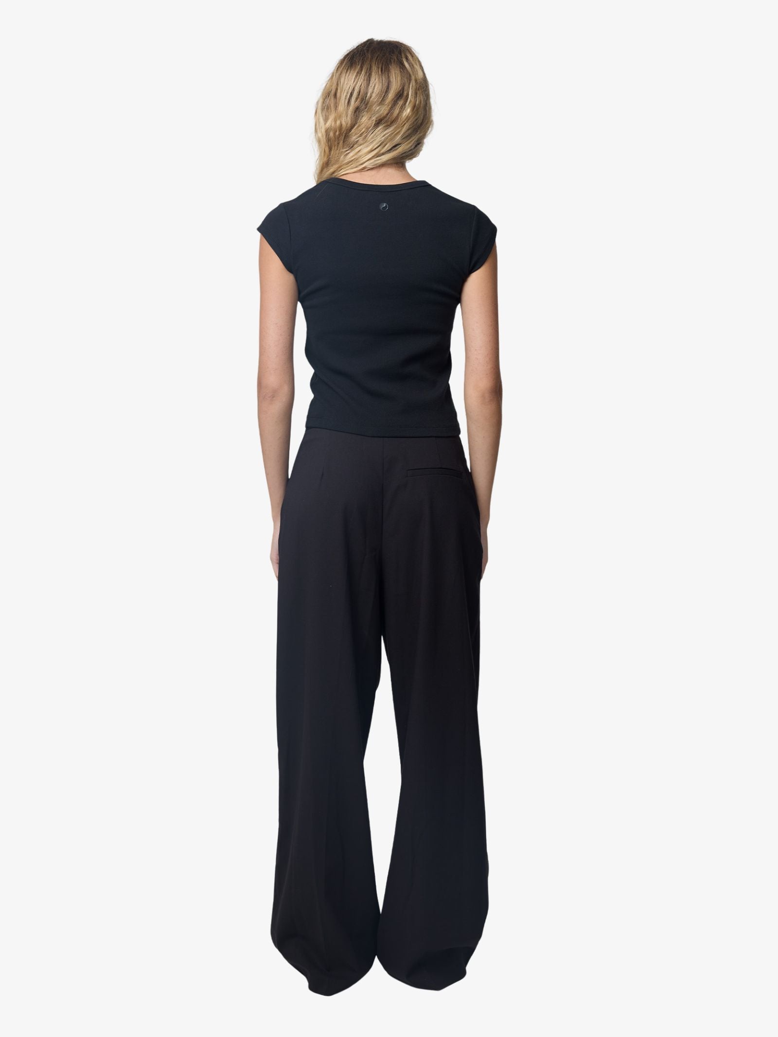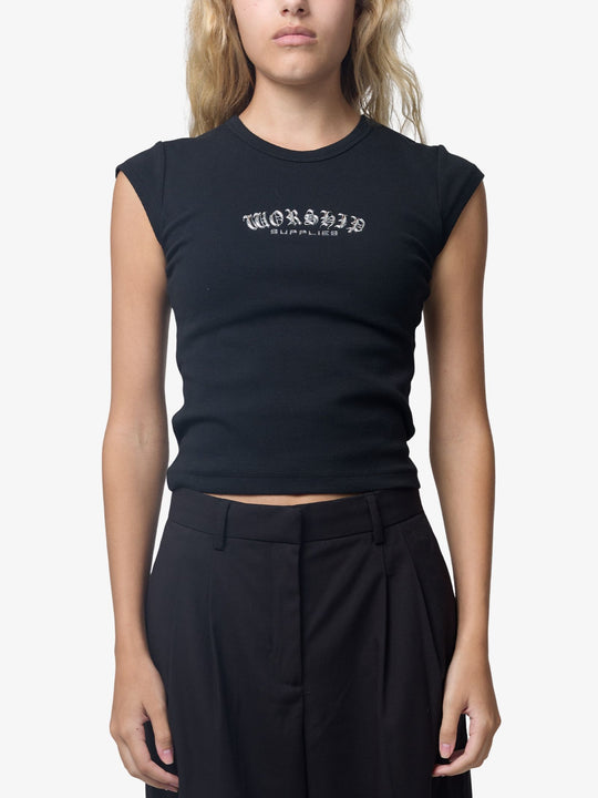 The Frequency Cap Sleeve Tee by Worship is a fitted, short-sleeve top in a black ribbed knit, featuring a small white graphic print across the front chest. The top has a crew neckline and distinctive cap sleeves.