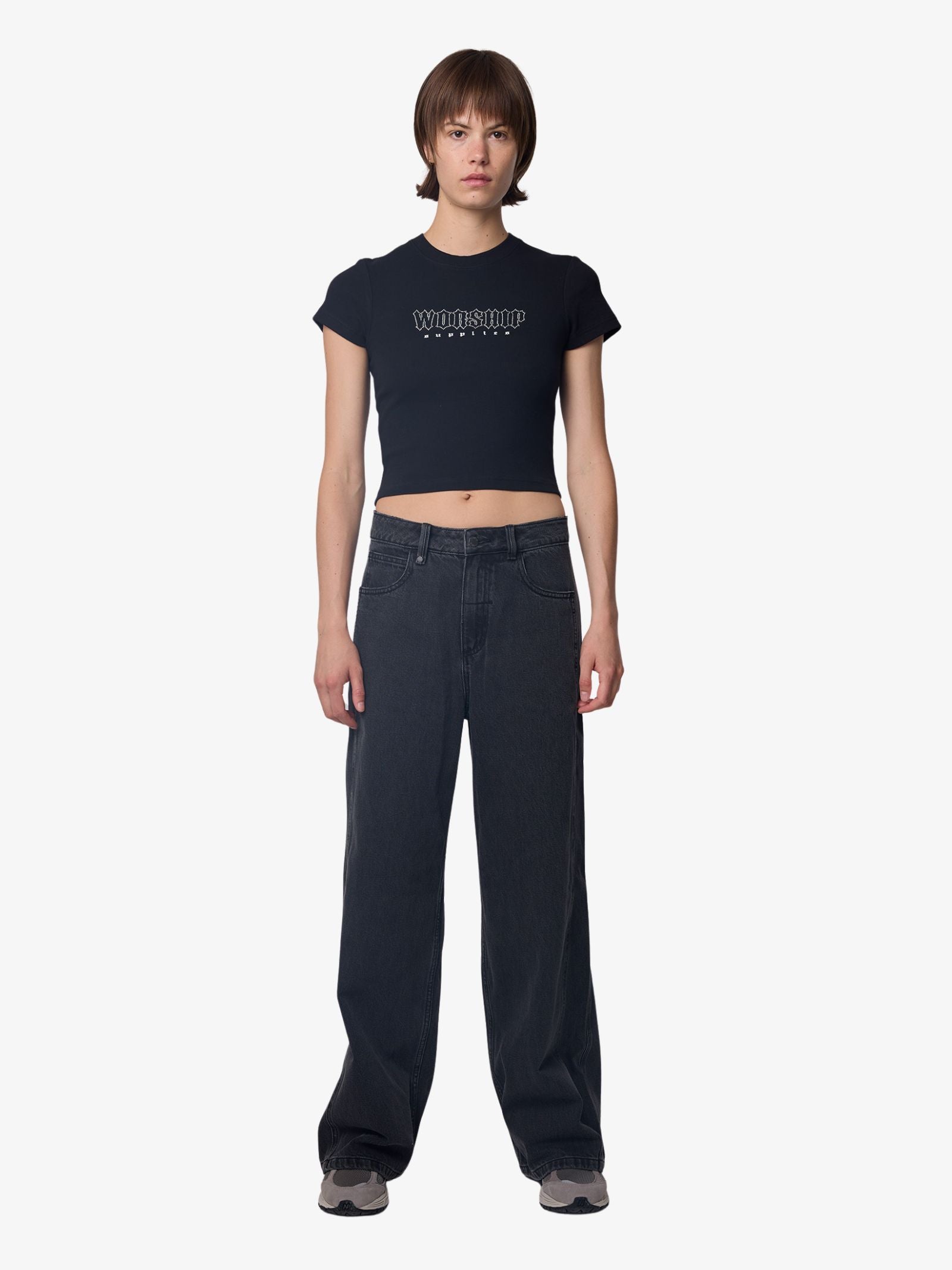 The Glitz Slim Fit Rib Tee by Worship is made from a lightweight organic cotton and elastane rib blend that is soft and comfy. This short-sleeve shirt serves retro attitude with a flattering, fitted cut and features a sparkle logo hit across the chest for a touch of glitz.