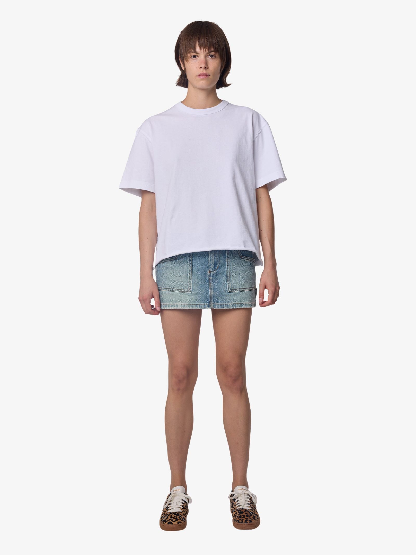 The Jilted Micro Skirt by Worship is made from durable cotton denim with a light, vintage wash and designed with a fitted, mini length. This short skirt features workwear-inspired details, including reinforced front patch pockets and a small logo label on the back.
