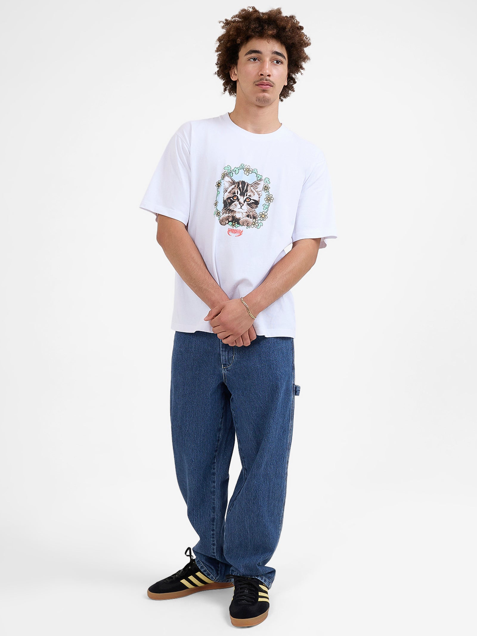 This t-shirt features a loose fit and classic crew neck, ensuring a laid-back silhouette that's perfect for everyday wear. The standout cat graphic on the center adds a touch of fun and personality to your fit. Crafted for comfort and designed to delight, the Playtime Tee embodies Worship's unique blend of casual ease and creative flair.