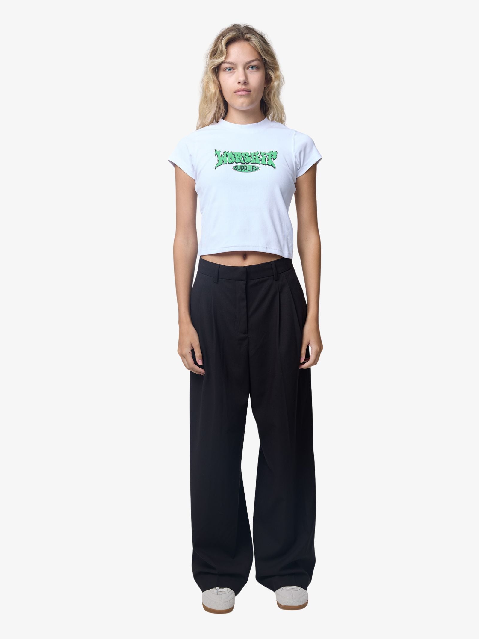 The Whisp Teeny Tee by Worship is a fitted, short-sleeve crop top featuring a crew neckline and a prominent green "WORSHIP SUPPLIES" graphic print across the chest. The tee is cut in a body-hugging, short length that exposes the midriff.