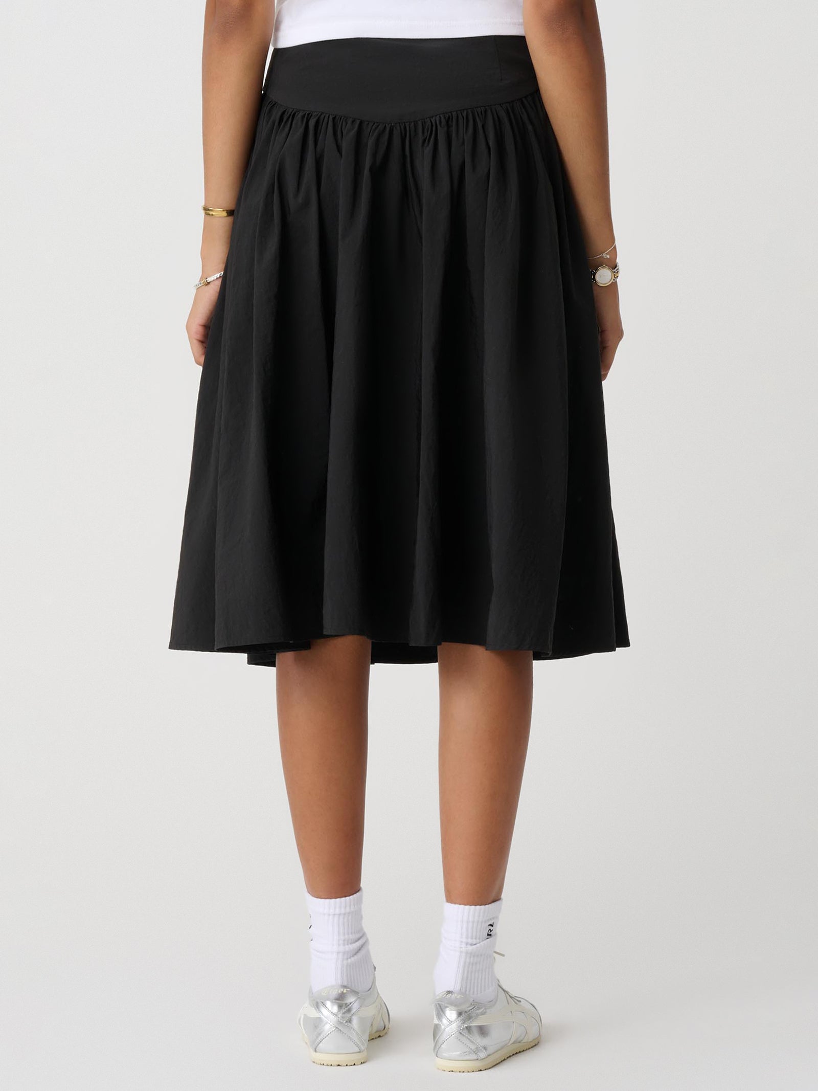 This black flowy midi skirt features a low rise waist, pleated detailing for a relaxed fit, and a flared shape that falls below the knees. Ideal for styling your way in a timeless black colourway.