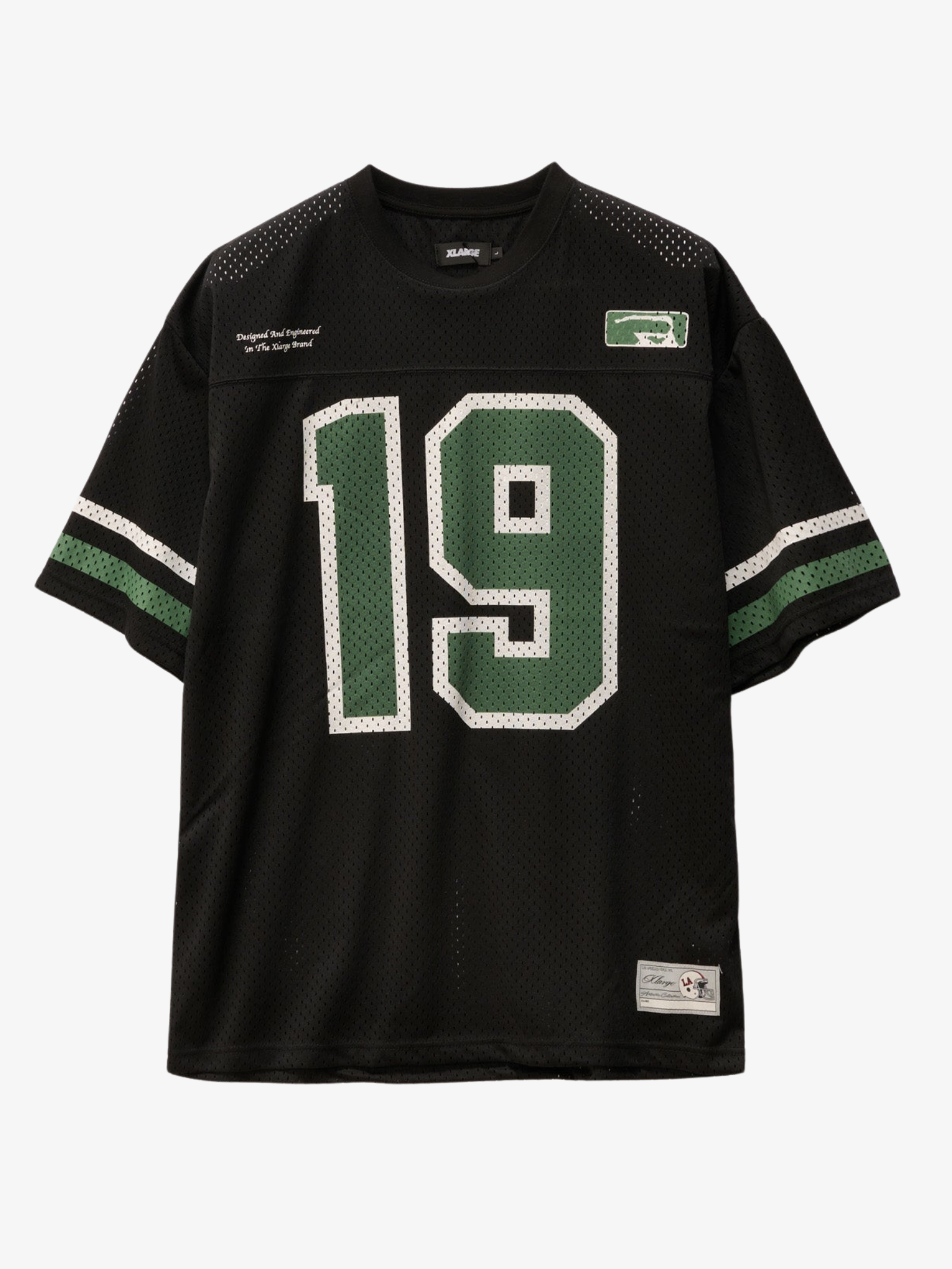 The Engineered Game Shirt in Black by XLARGE is designed with oversized, boxy silhouette and breathable mesh fabric. This tee features bold screen-printed graphics across the chest, ribbed collar detailing and coverstitched seams.