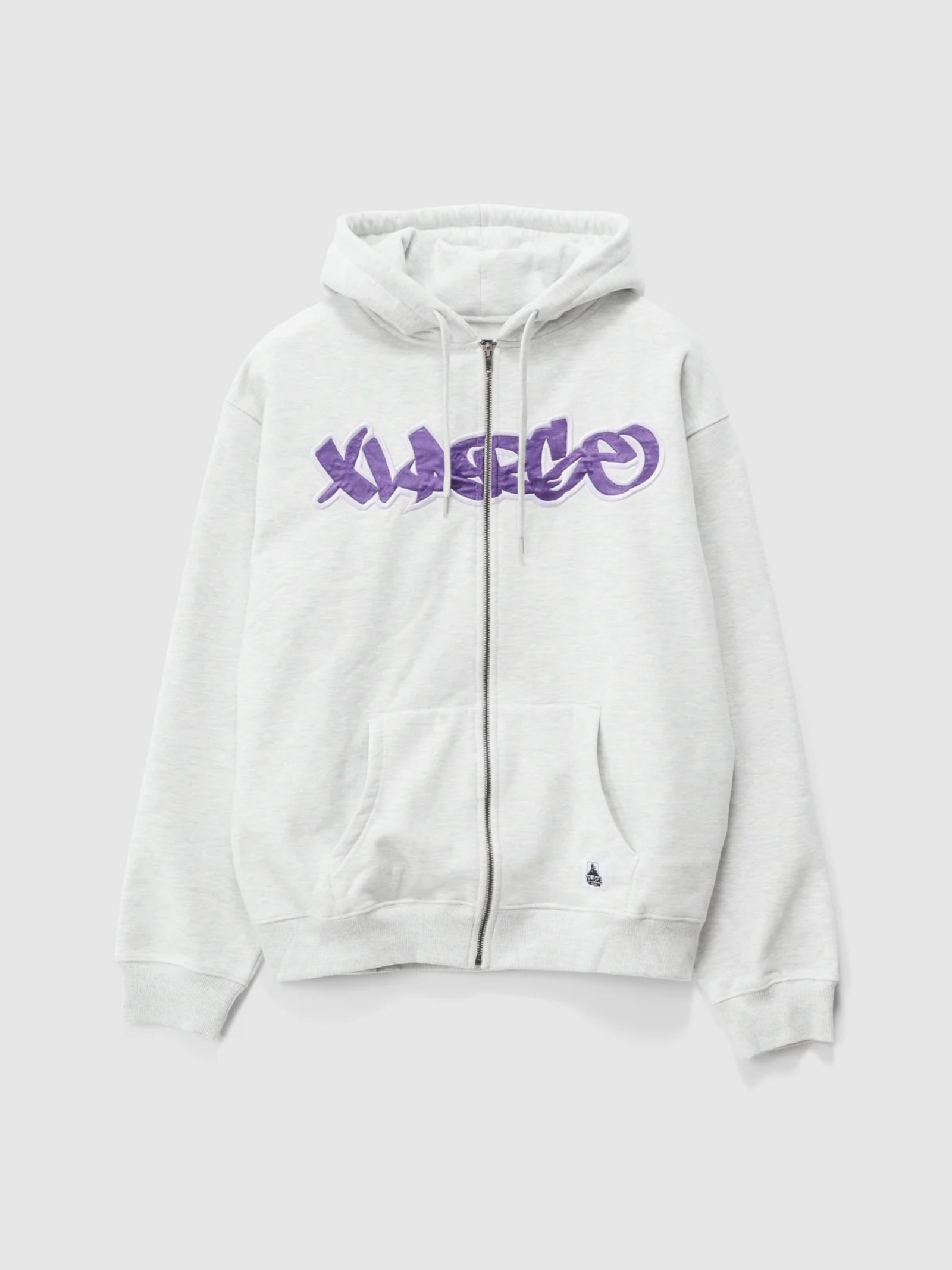 The Mark Zip Thru Hood by Xlarge offers a fitted, unisex silhouette with piped raglan sleeves and embroidered satin artwork. Its heavyweight brushed cotton makes it a staple for comfort and street style.