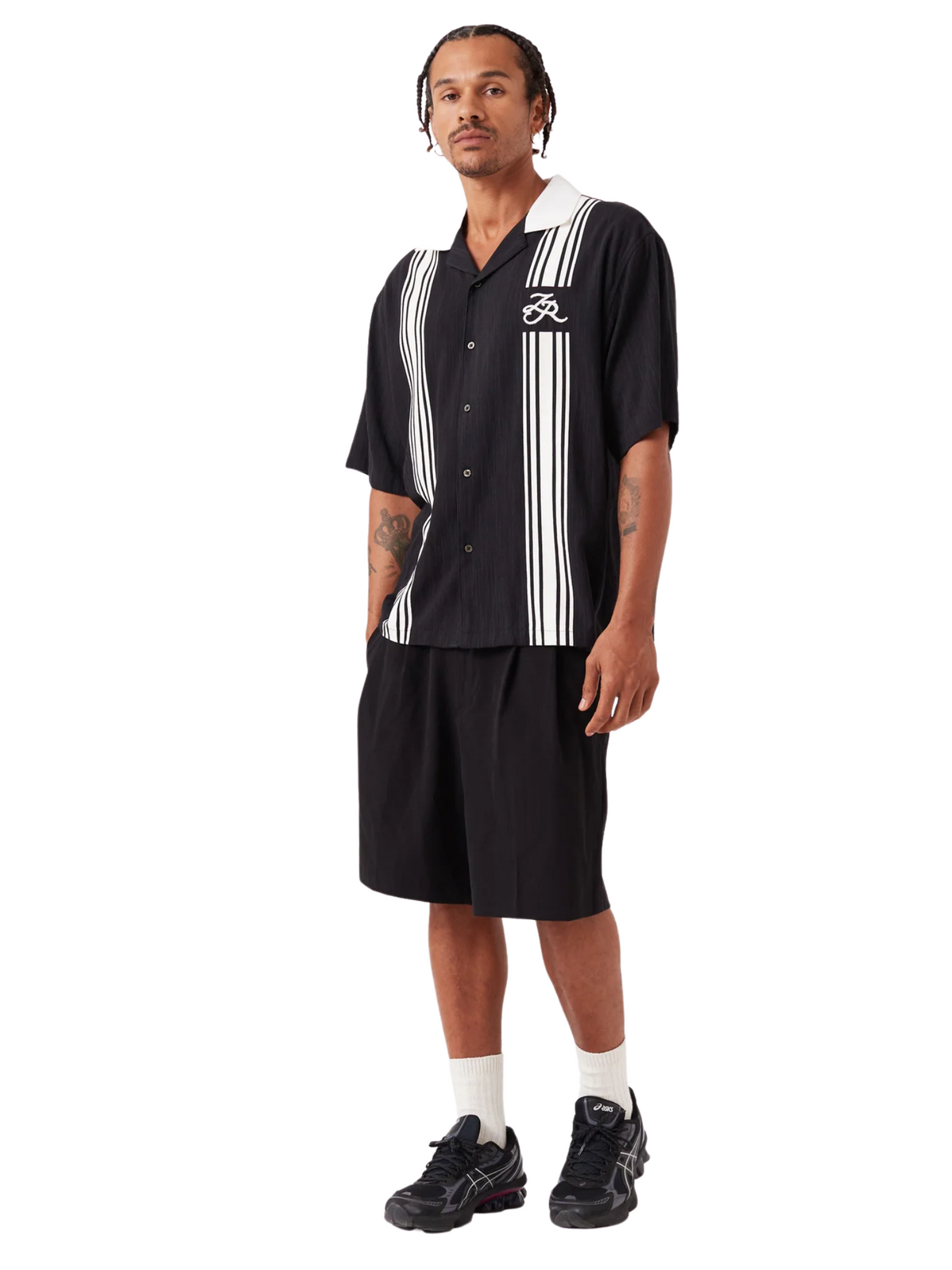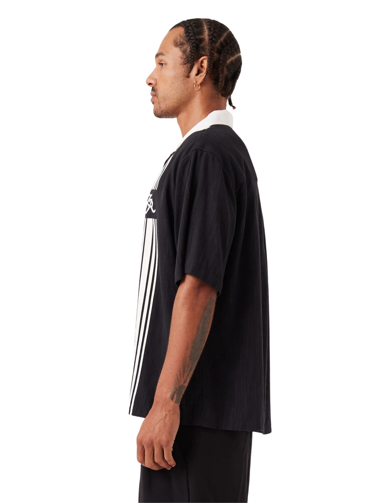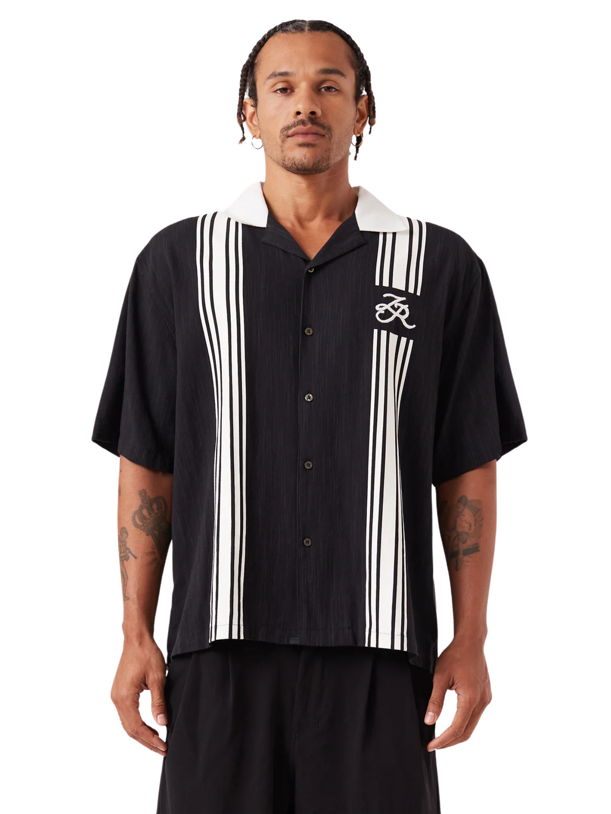 The Bowling SS Shirt in Black/White by Zanerobe crafted from a breathable rayon-cotton slub blend. This short sleeve t-shirt features a chunky chainstitch embroidered ZR emblem.