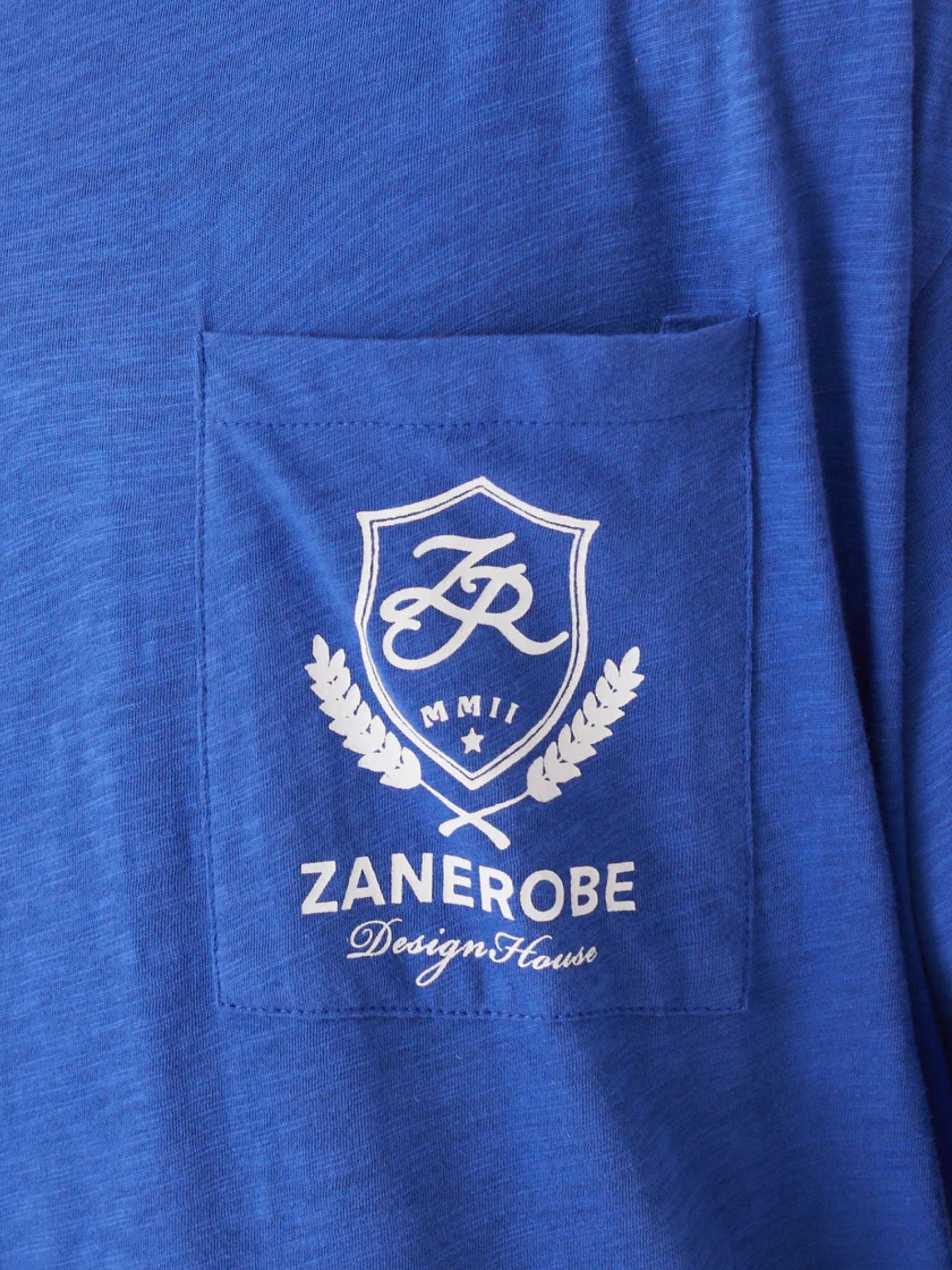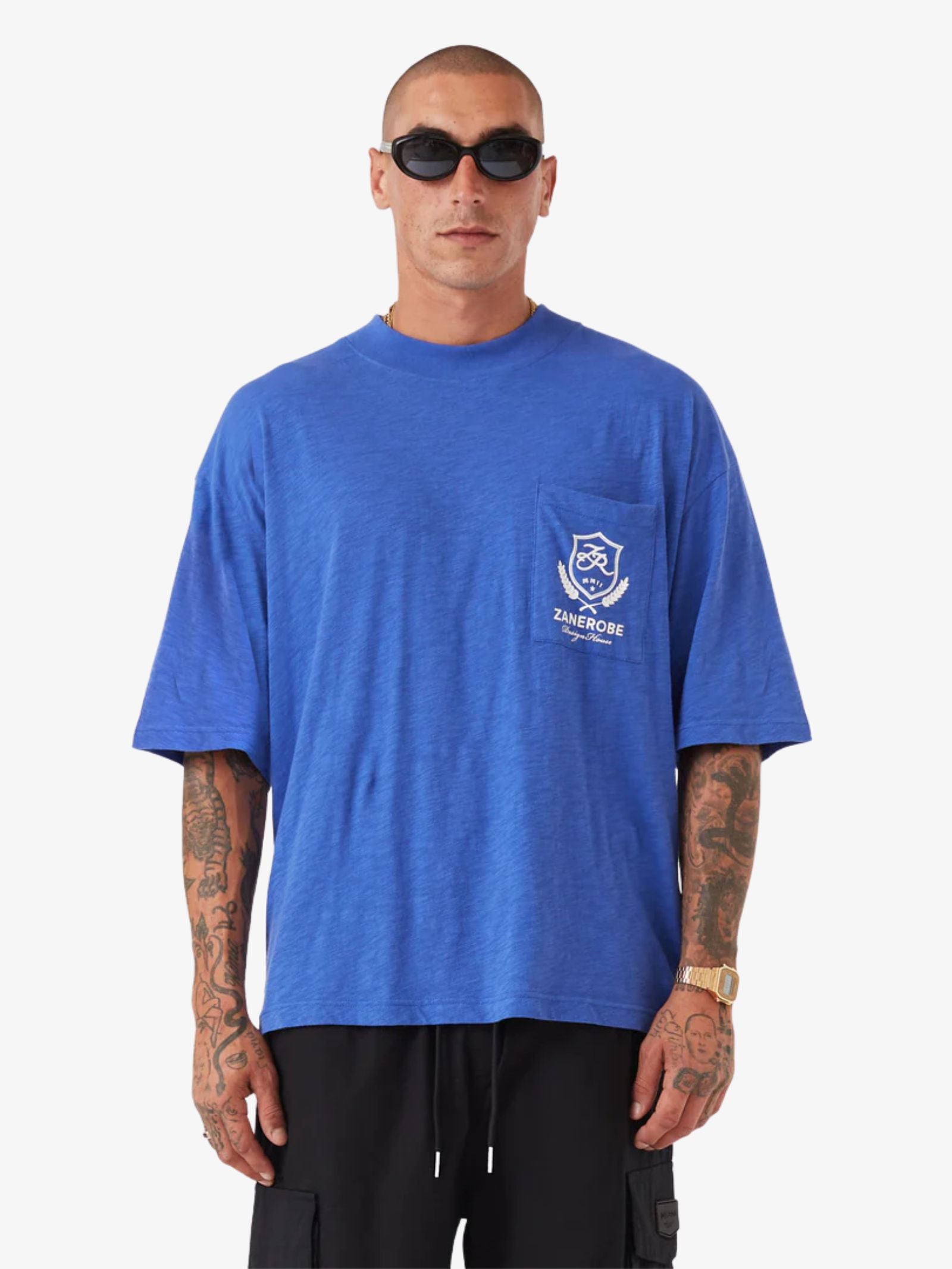 The Crest Slub Flow Tee by Zanerobe is a lightweight t-shirt made from slub cotton, featuring an oversized fit, dropped shoulders, and a patch pocket with a crest print.